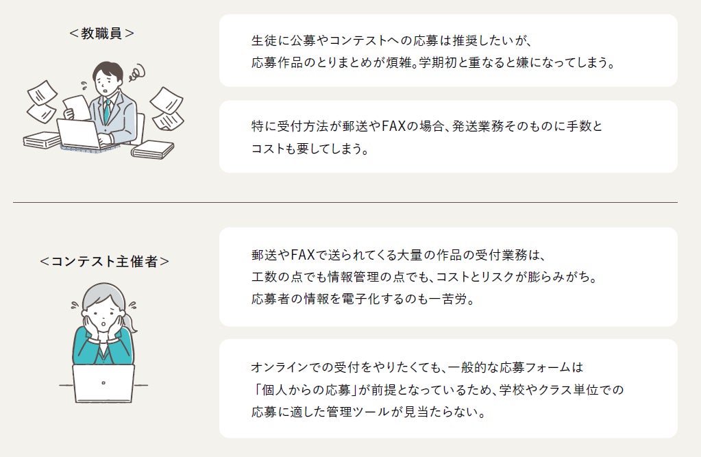 学生を対象とした公募やコンテストにおいては、教職員が学校やクラス単位で作品をとりまとめて応募するケースが多く、また応募方法はいまだ郵送メインというのが実情です。教職員やコンテスト事務局においては、