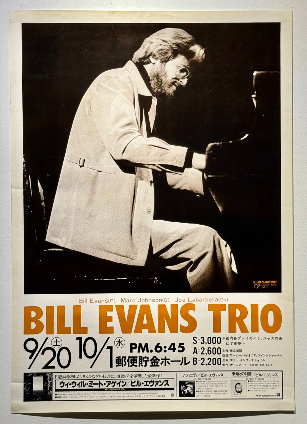 来日直前に逝去し、幻の来日公演になってしまったビル・エヴァンスの希少なポスターや、1978年12月12日に行われた、キース・ジャレットの日本武道館でのソロ・ピアノ・コンサートの希少なポスター、そしてTDKカセットが1977年に制作した非売品、「MILES DAVIS PORTRAITS 12」マイルス・デイヴィス・ポスター12枚セットなど、希少なポスターが並びます。