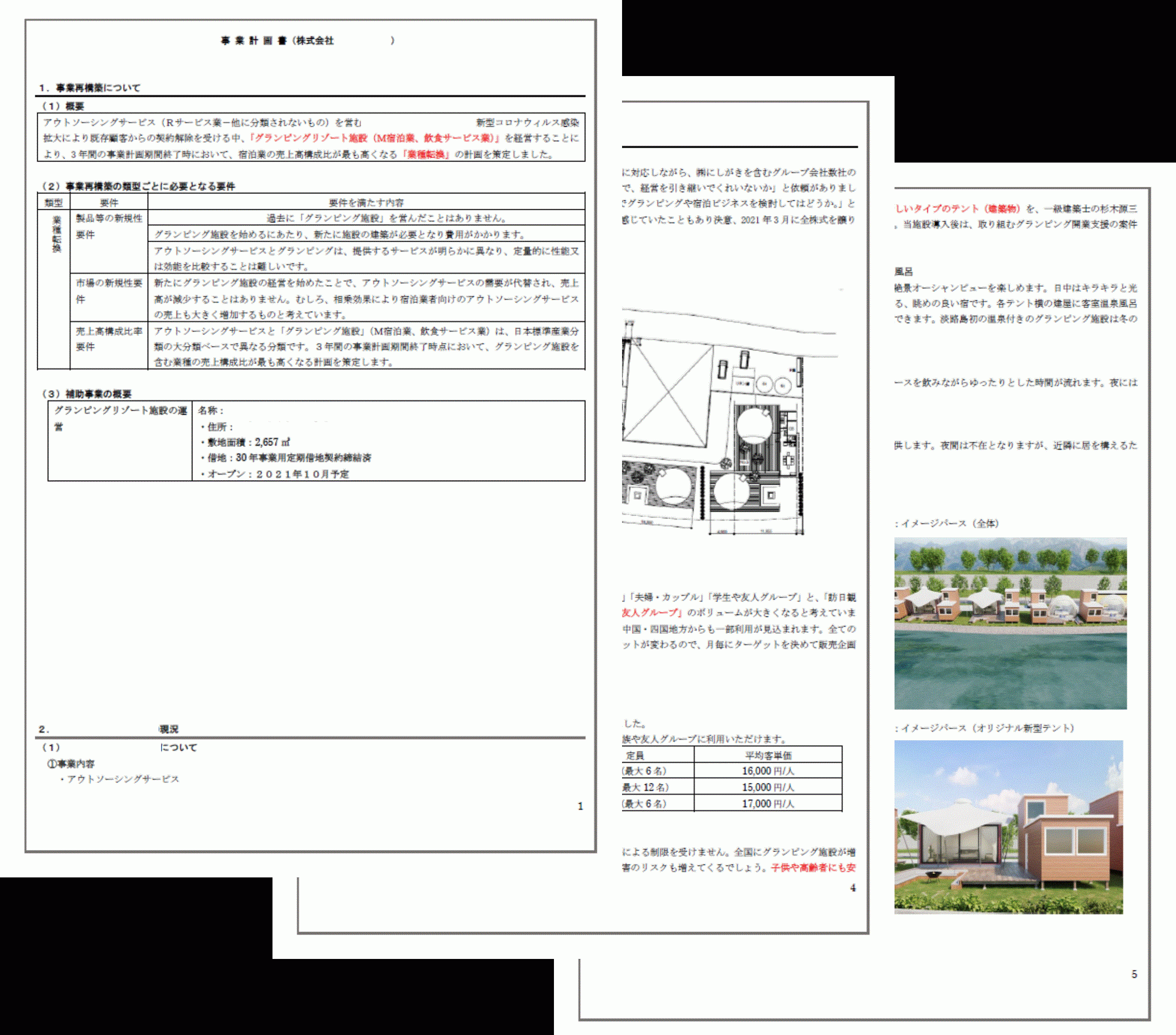 グランピング事業の特性を反映した上で、 公募要領で明確化されている採点基準(事業化点・再構築点・政策点)をカバーした雛形を活用して、 計画書を立案します。