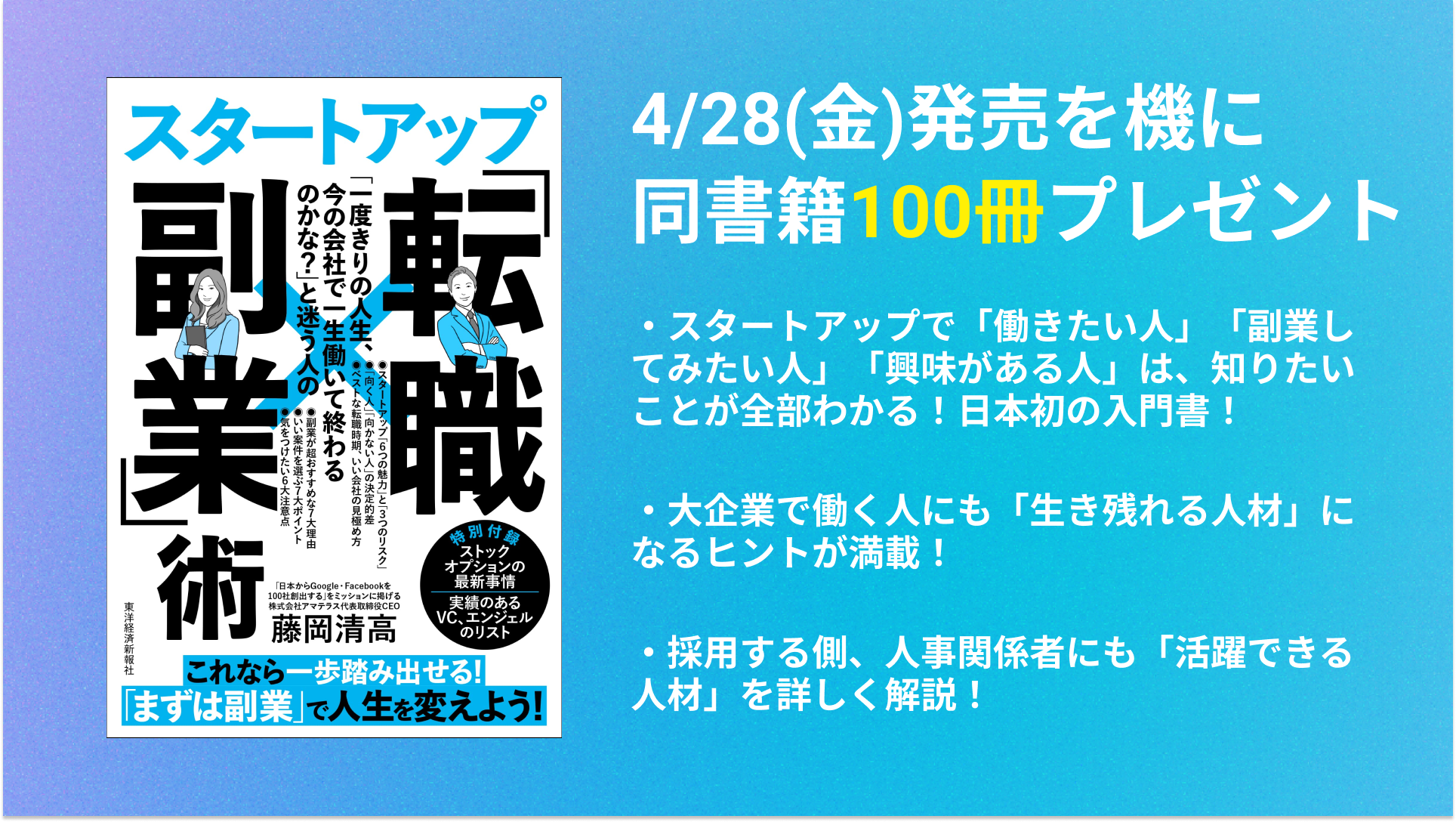 「能力」と「やる気」があるのに、大企業や組織内でくすぶっている人が、スタートアップでポテンシャルを発揮していく。スタートアップに入って幹部になり、大活躍をして、社会をよりよく変えていく。その人自身も仕事にやりがいを感じ、自己実現できて、金銭的にも潤って幸せになっていってくれる。これは何より、日本社会にとってもプラスの変化だと思うのです。本書を通じて、「スタートアップに身を投じてみたい」と思う人が、ひとりでも多く生まれてくれればと願っています。