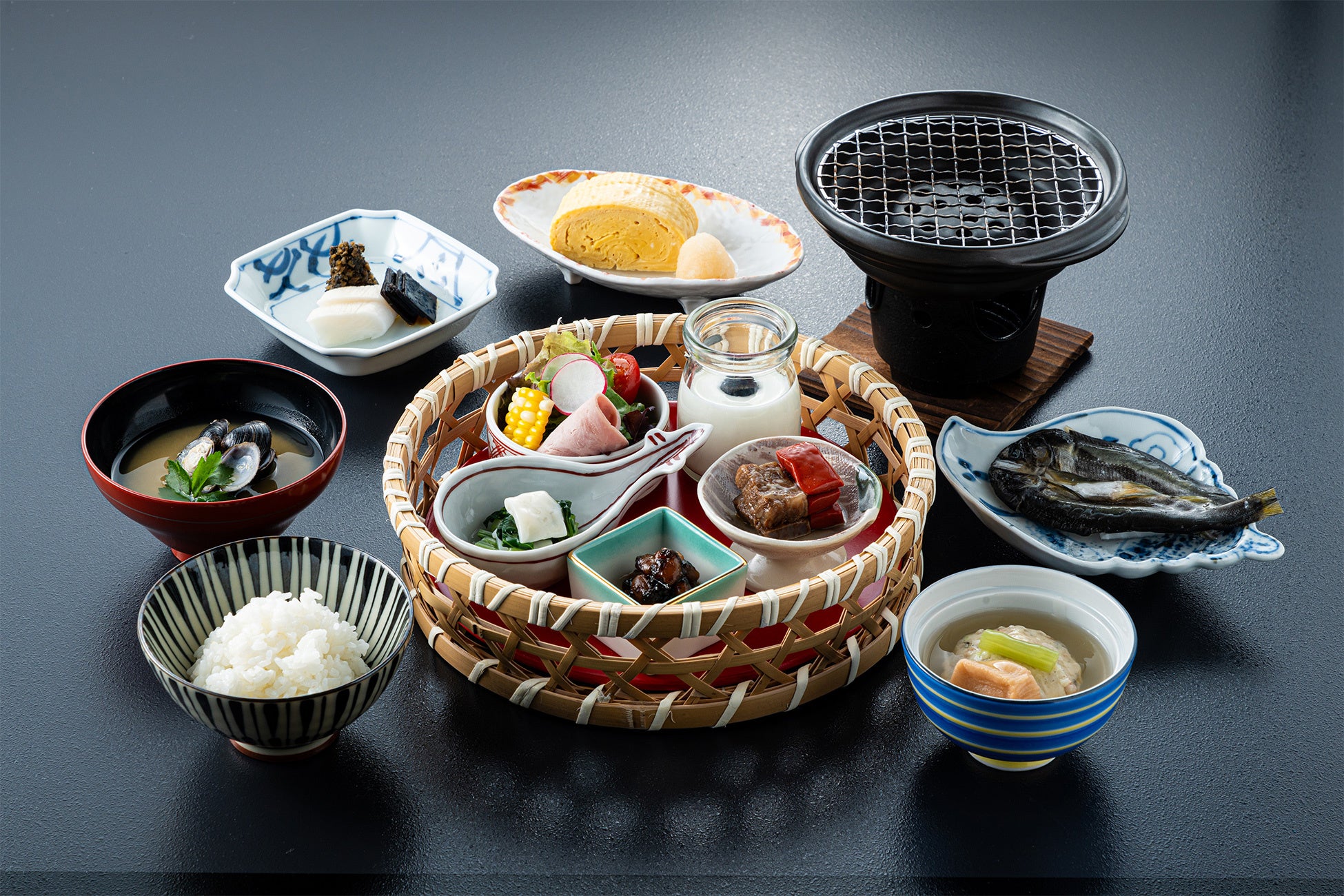 琵琶湖産いさざ佃煮、近江八幡蒟蒻、湖魚の干物、近江野菜など滋賀県の特産食材を使用した「湖国の朝食」をご用意します。