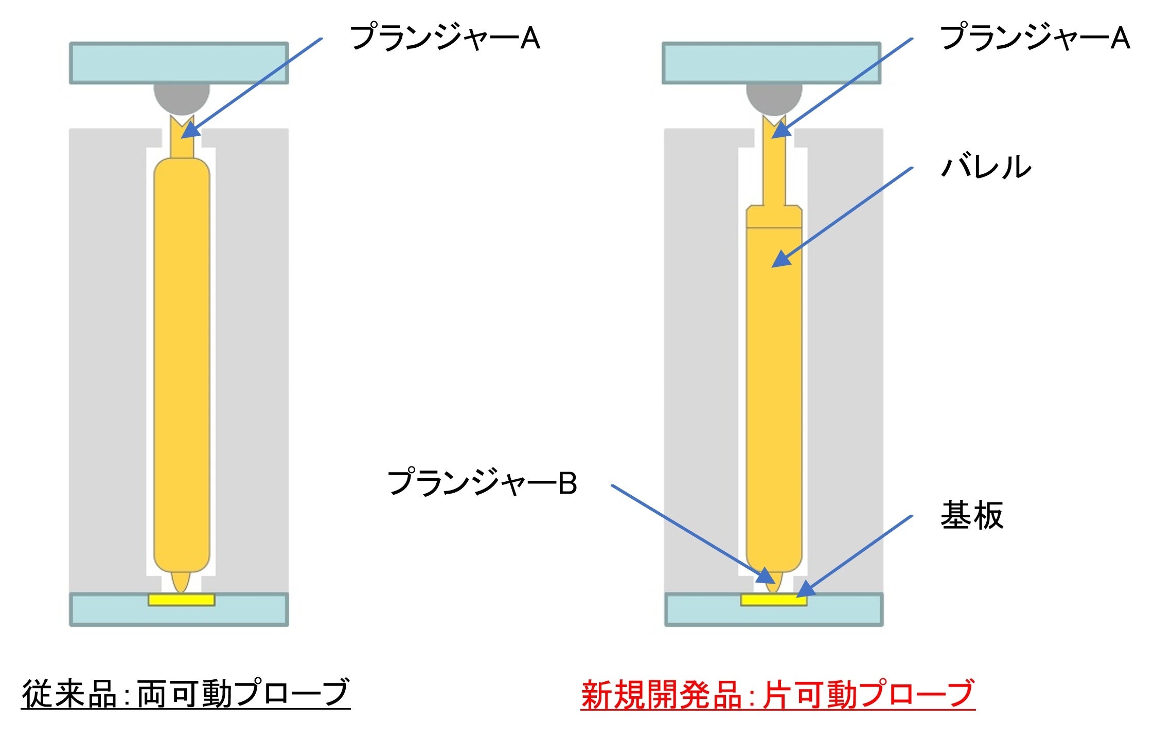 新開発の低抵抗プローブは、まず、プランジャーの可動を片側だけにする、片可動プローブを採用することに加え、ばね荷重を高くすることで抵抗値を大幅に削減しています。さらにそれら既存技術に加え、プランジャーの先端形状とばね構造を最適化することで、プランジャーと基板との抵抗値の削減を図っています。