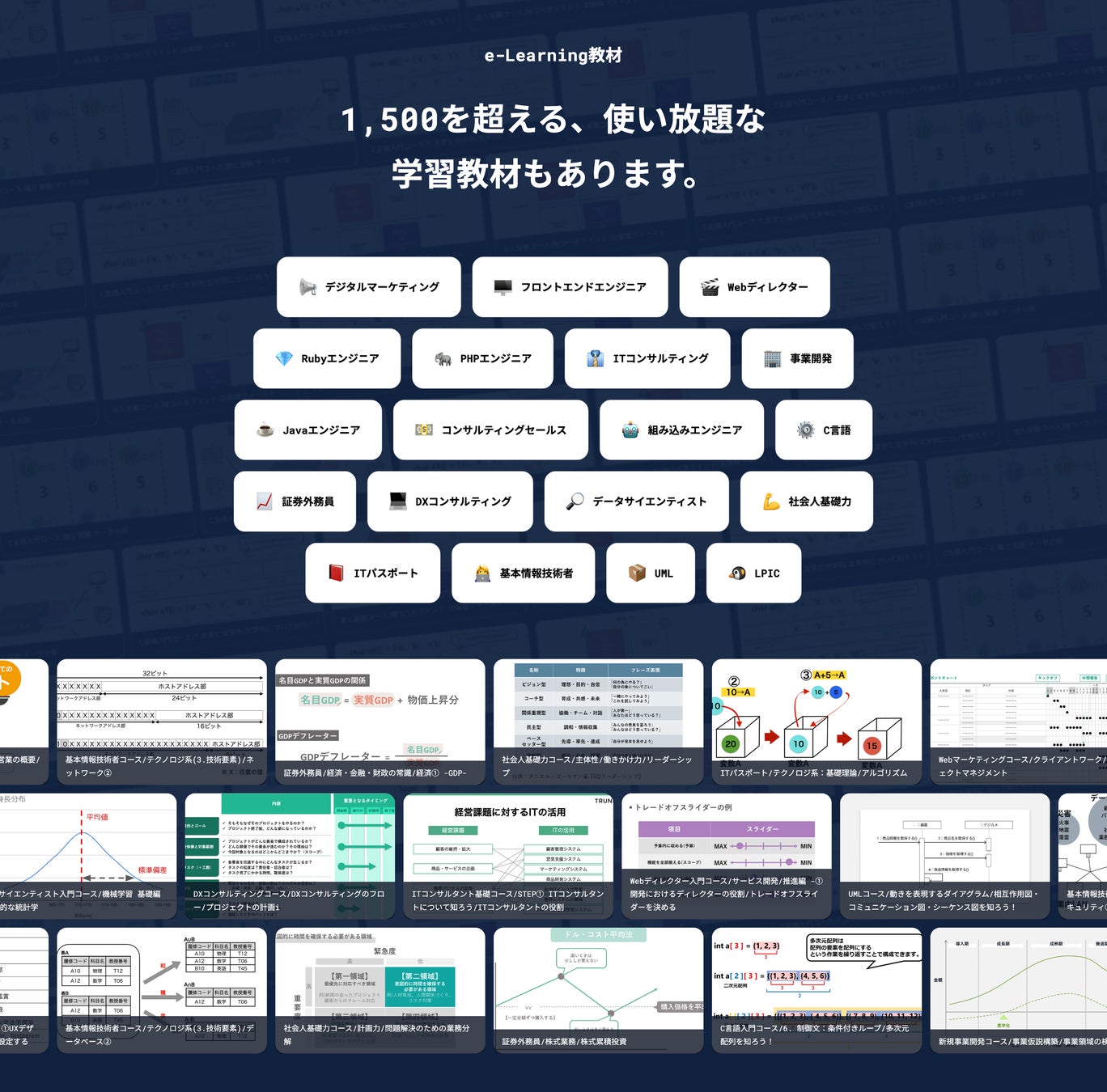 また、1,500を超える学習コンテンツも利用可能です。部門別・階層別にラーニングマップの作成をすることもできます。
