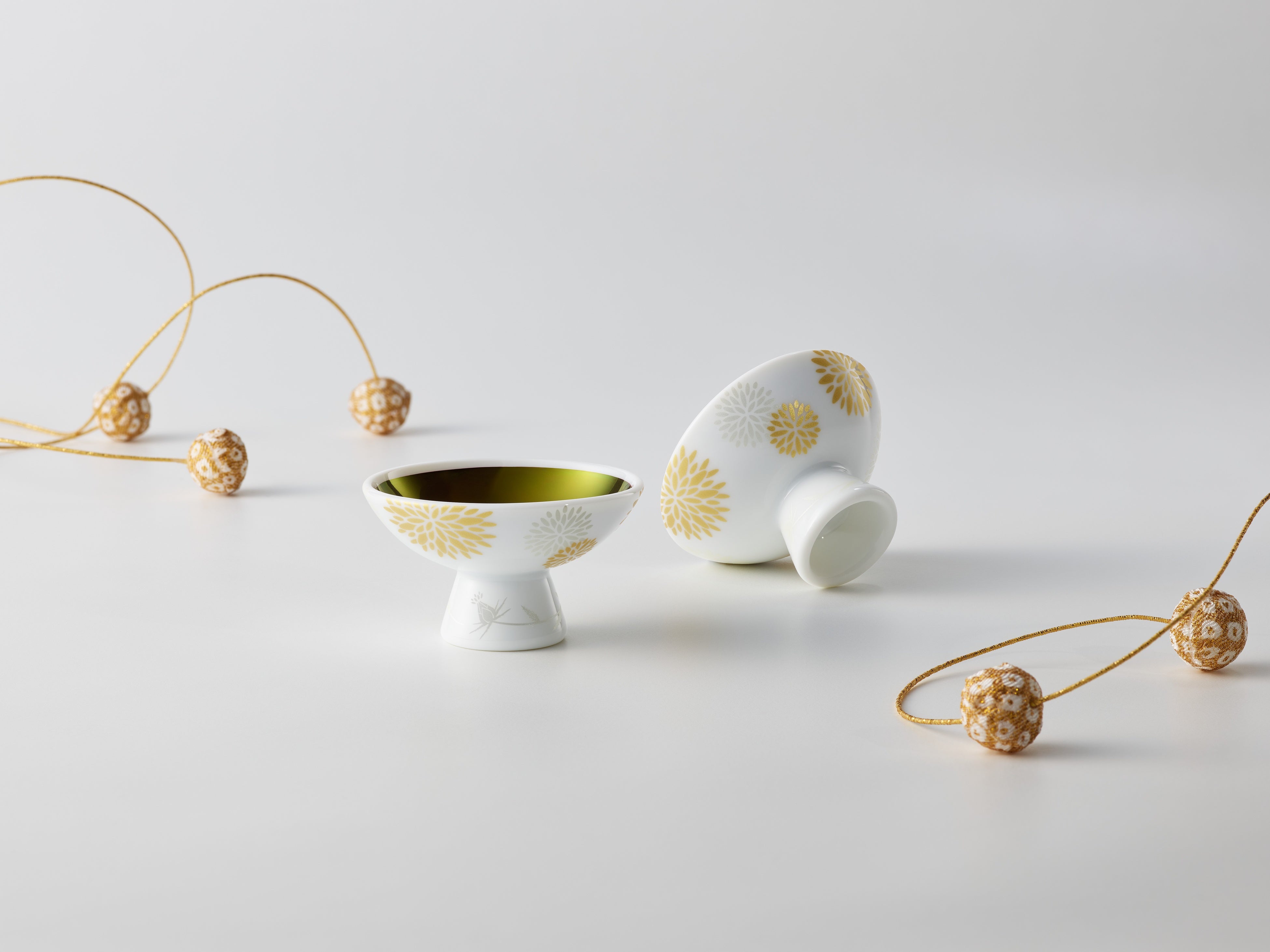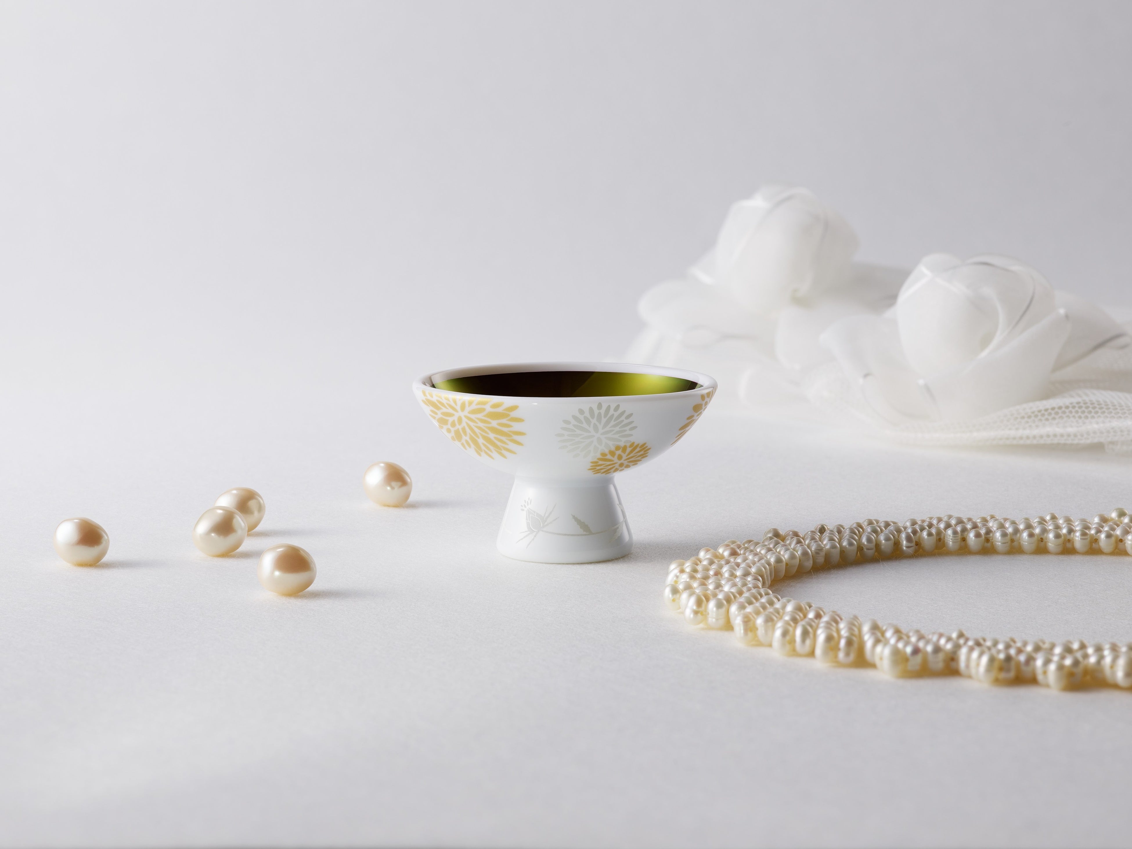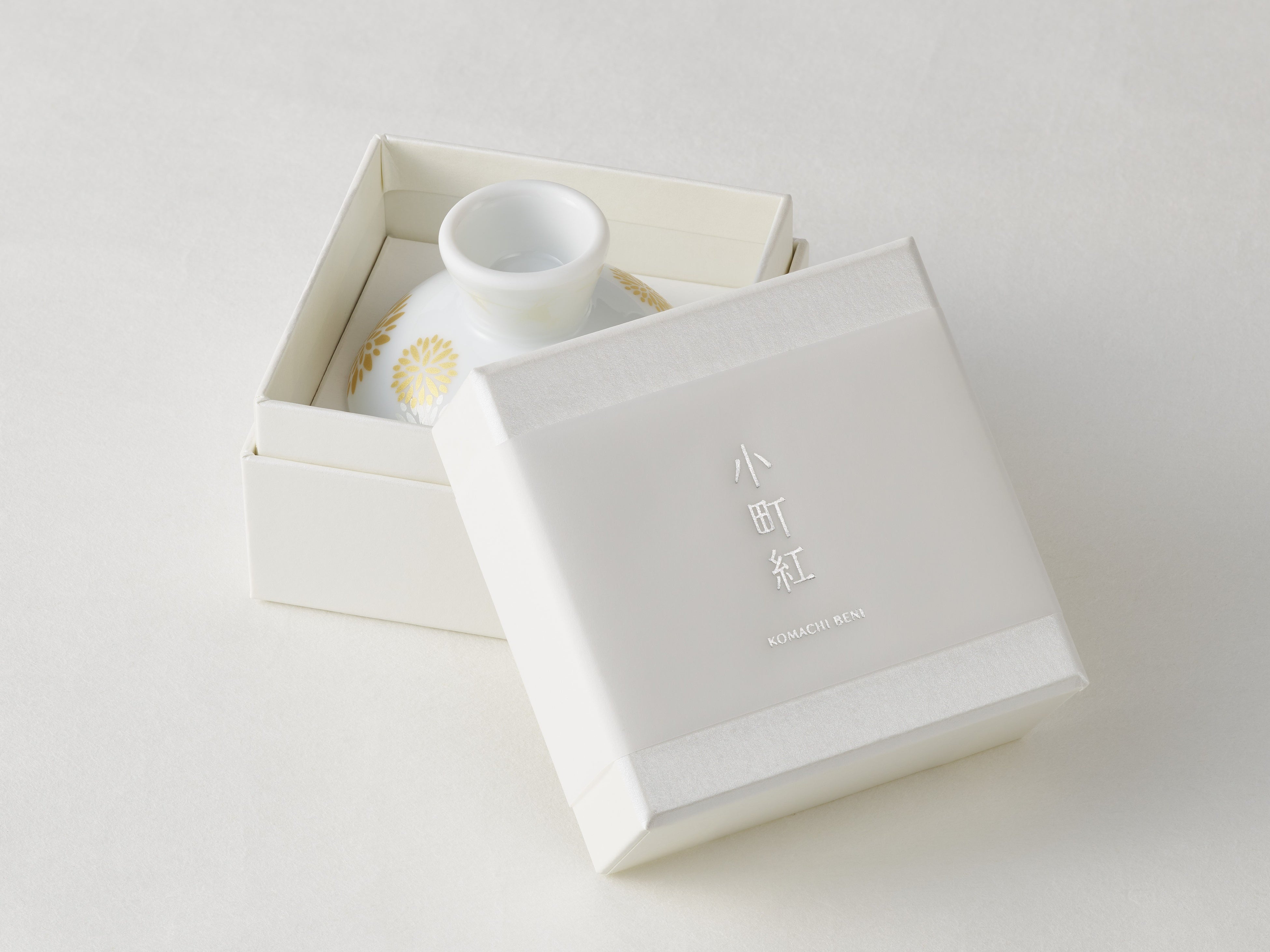 この日本の伝統的な紅を、ウェディングドレスのように清楚な白磁に金と白銀の紅花を散らしたお猪口に刷きました。これからさきの幸せを願いながら、ハレの日のお支度の仕上げに紅を点す、そんなひとときにお使いいただきたい逸品です。
