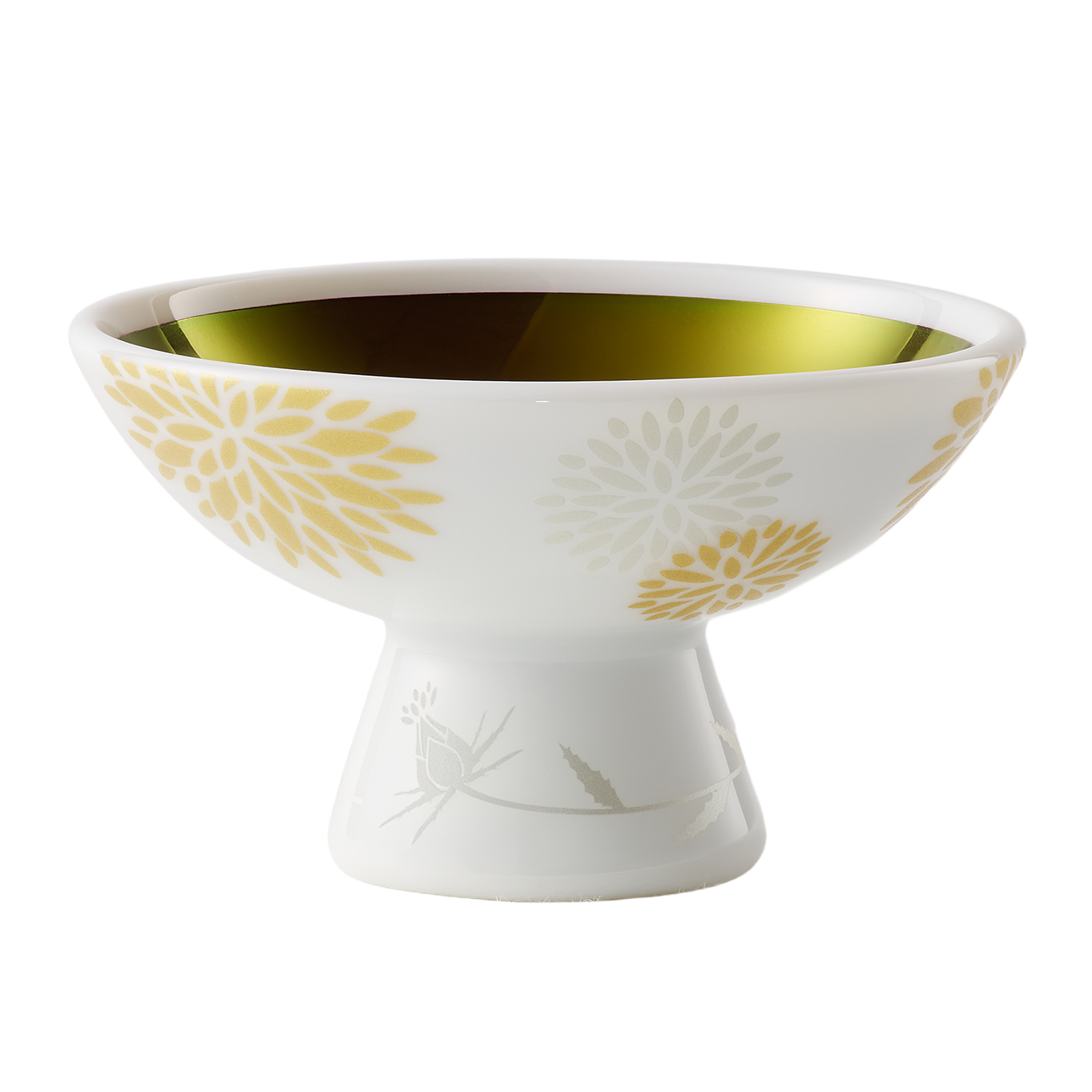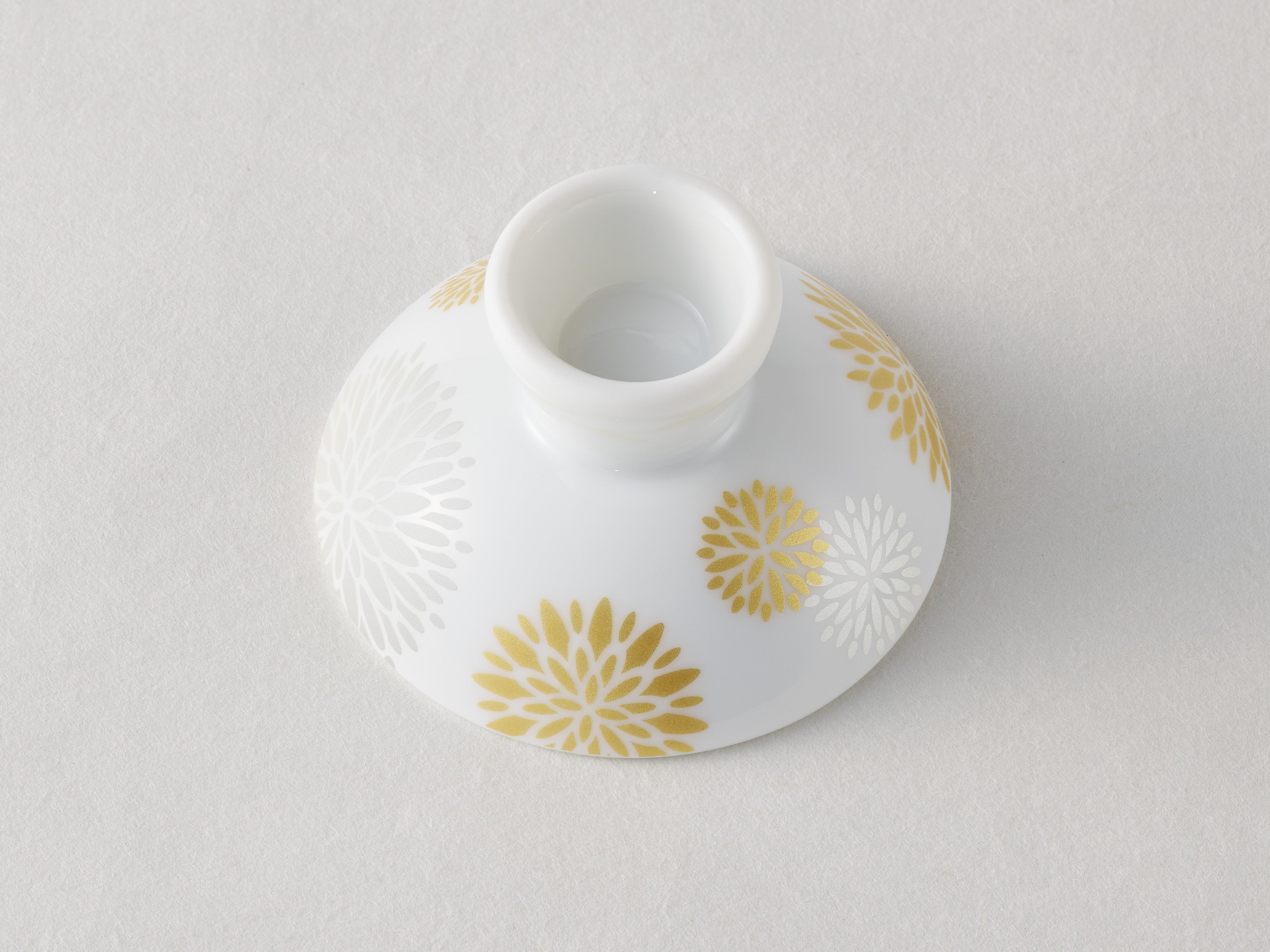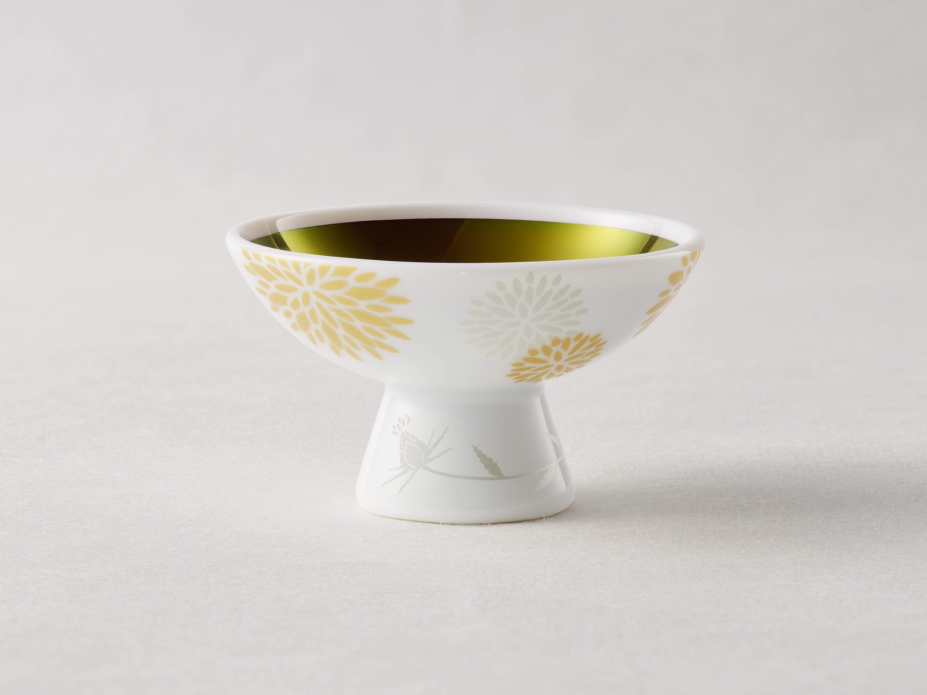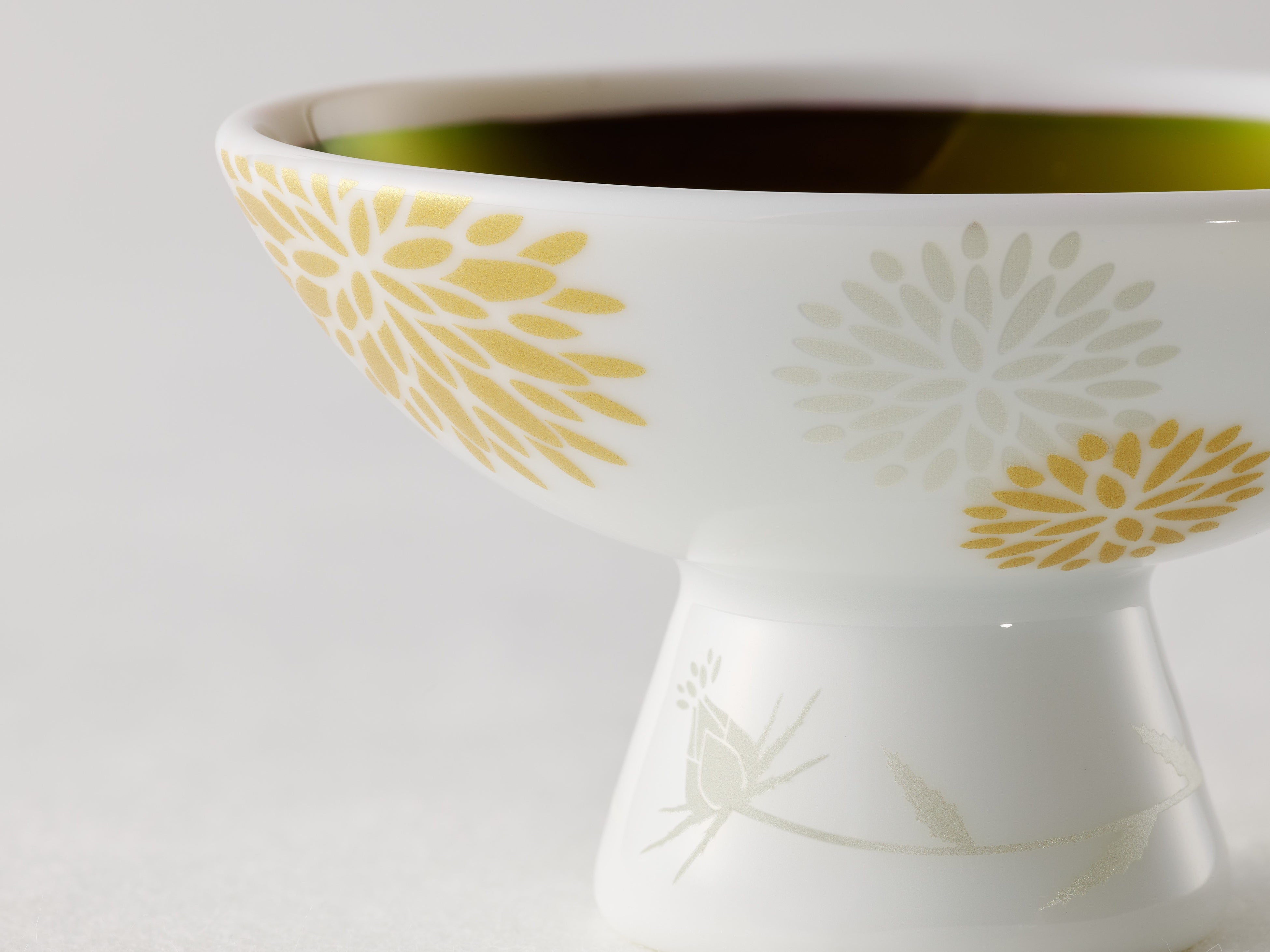 紅の玉虫色の輝きは、上質な証。水に触れた瞬間、幻想的な輝きから鮮やかな紅色へと変わります。この度、紅猪口(べにちょこ)のデザインに、美しい色を秘めた紅花が咲き誇る様子を採用。艶消しのゴールドとシルバーで清楚に表現しました。高台には、これから花開く一輪の紅花を描いています。