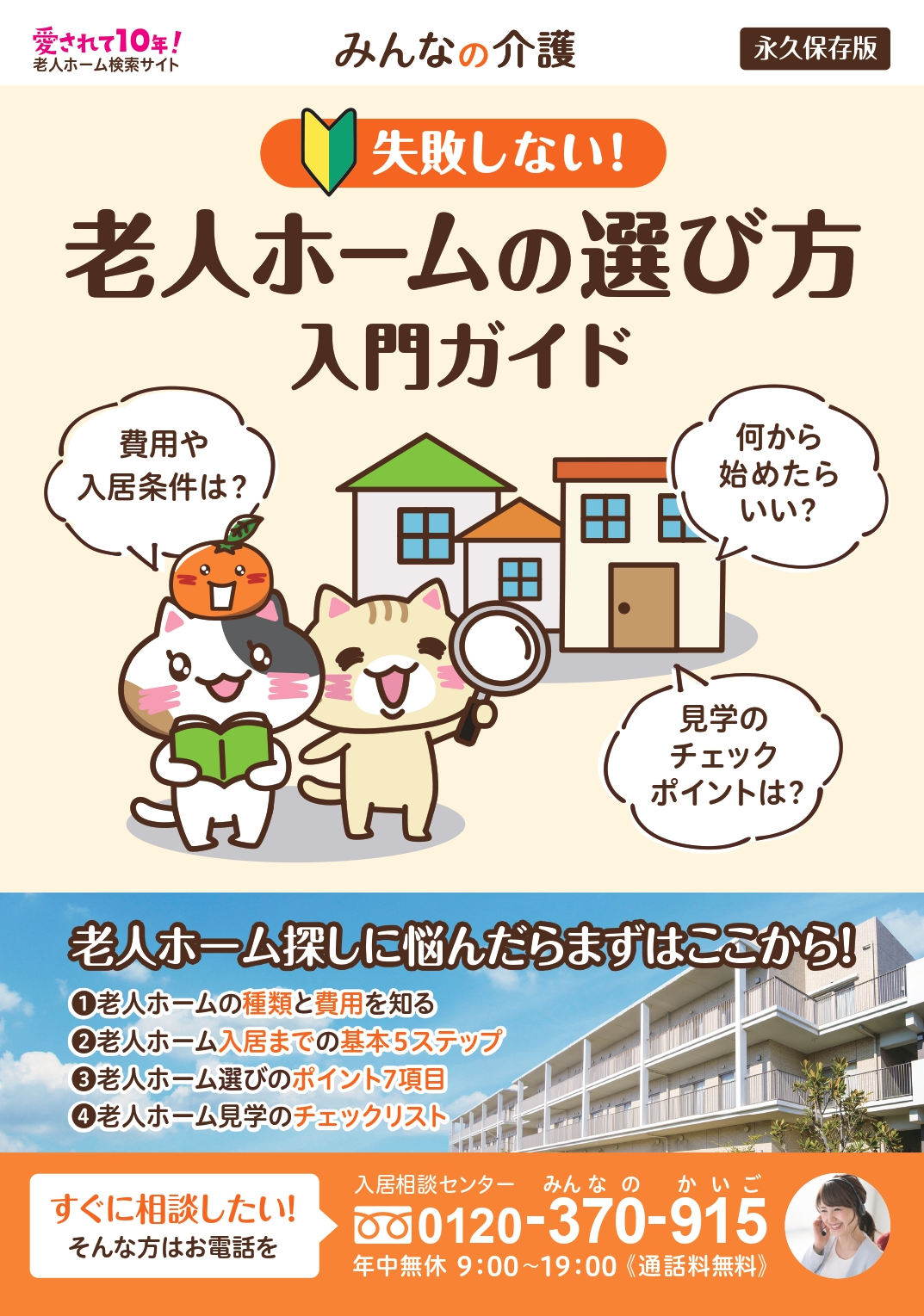 ご家族にピッタリの老人ホームを問題なく探せるように、「みんなの介護」は『老人ホームの選び方 入門ガイド』を制作いたしました。種類や費用など老人ホームにまつわる正確な情報をまとめ、老人ホーム選びのポイントをわかりやすく知ることができます。