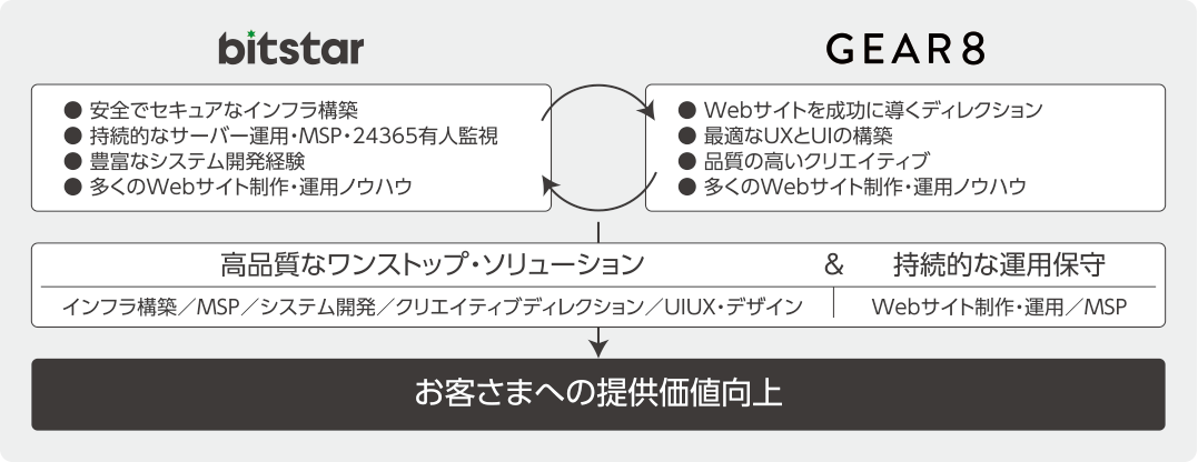 今回の提携を通じて、ビットスターの強みである「高いセキュリティを含めたMSP事業、システム開発」をギアエイトが、ギアエイトの強みである「最適なディレクションによる品質の高いWeb制作」をビットスターが、それぞれサポートを受けることになります。その結果、お客さまは1度の依頼で総合的にクオリティの高いWebサイトを運用することが可能になります。さらに本提携は、業務提携により両社が得意とする業務範囲により集中できる環境の獲得につながることで、更に品質の高いサービス提供も目指すものです。
