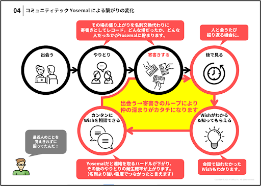 そこで、出会う人の数が増え続ける現代社会において、その限界を超えるためのappをコワーキング企業であるアトミカ社(ディー・サインのグループ会社)が開発致しました。ユーザーが新たな人と出会うたび、名刺交換に代わりグループで記憶に残る形でレコードできるapp、Yosemalです。その他、相談事を気軽にWISHとして共有でき、関係の積み重ねをappに蓄積できるようにデザインされており、コミュニティ内での助け合いが自動で発生しやすくなります。テクノロジーの力でプライバシーを保護しながらも、人と人のつながり=SOCIAL KNOTの量や度合いが可視化することで、コミュニティの起ち上がりと改善を支援します。