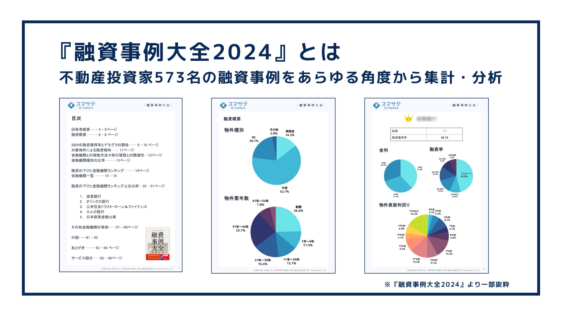 不動産オーナー向けAI家賃査定ツール「スマサテ for Owners」を運営するスマサテ株式会社(本社:東京都品川区、代表取締役社長:山岸 延好)は、2024年末に実施した不動産投資家573名へのアンケート結果をもとに作成された「融資事例大全2024」の好評を受け、続編となる「融資事例大全2025上期」の制作を決定しました。