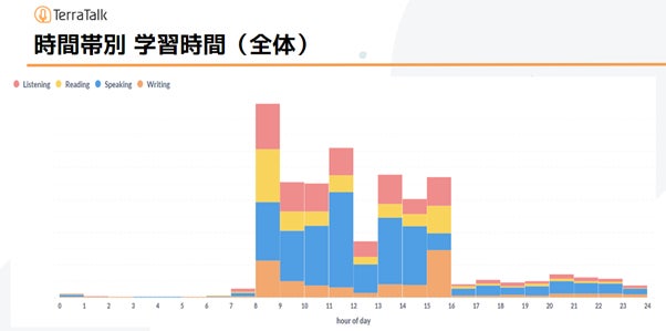 実証参加校のうち8校分の利用者の学習時間を24時間別に集計したグラフ。4技能別に色分けをして表示しており、学校毎の集計もできるので、授業内外での学習量を比較可能。