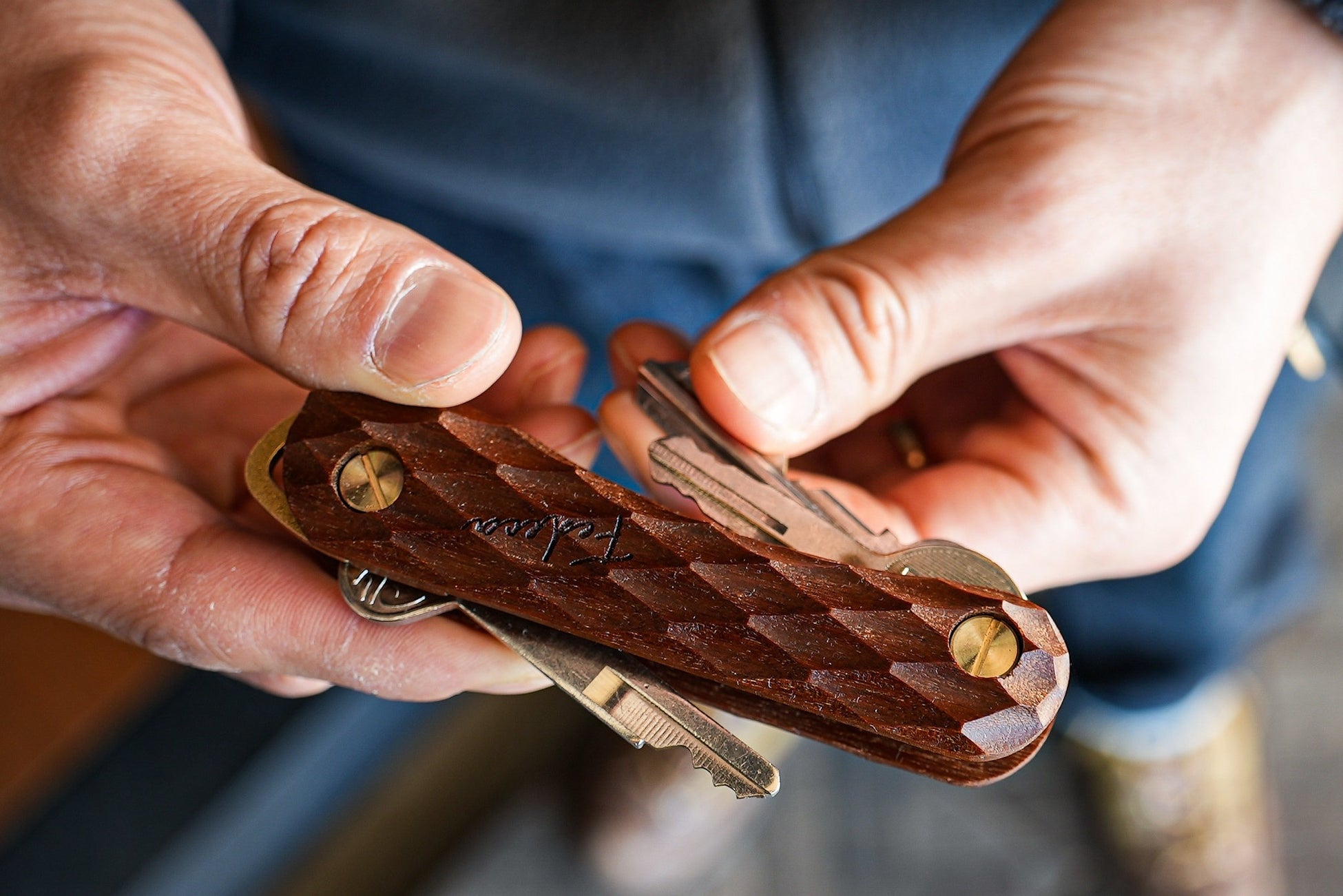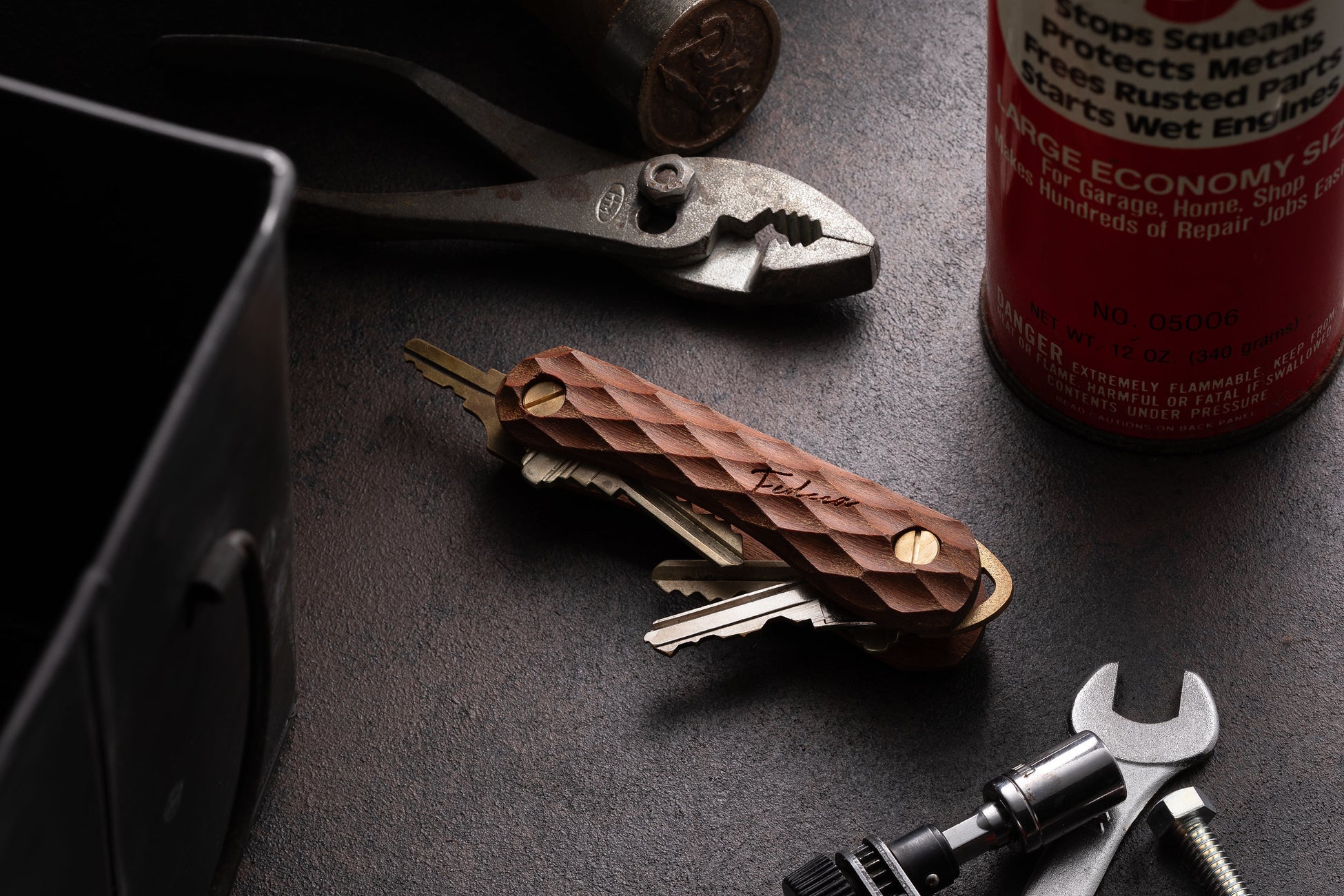 私たちは、伝統的な技術と素材を現代のライフスタイルに合った形で再構築し、新たな価値を生み出すことを大切にしています。毎日手にする鍵にこそ、心地よい質感と経年変化を楽しめる素材を使いたいと考えました。使い込むほどに手に馴染み、木材や真鍮の風合いが変化することで、まるでナイフのように「育てる楽しみ」がある道具に仕上げました。