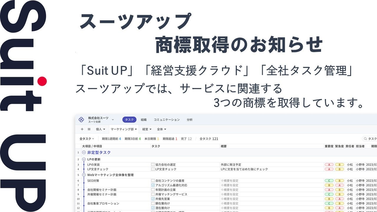 「Suit UP」、「経営支援クラウド」及び「全社タスク管理」の商標を取得