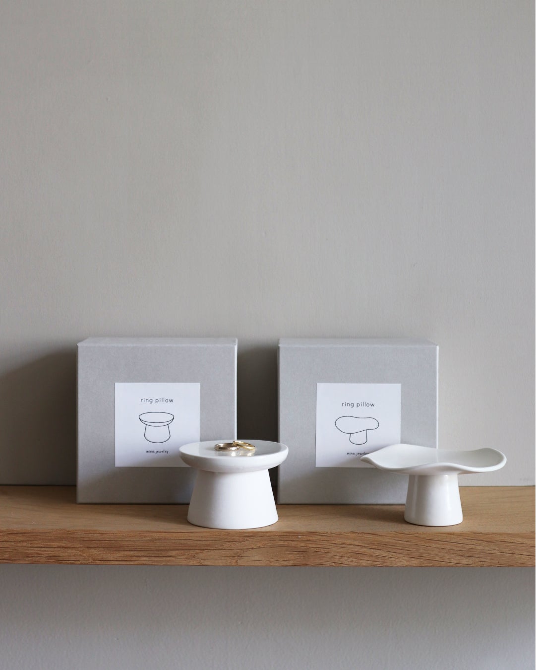 結婚指輪を購入されるお客様から「リングピローの販売はありますか?」とお声をいただくことが多くあり、以前より販売しているガラス製のものに加え、白色の陶器製のものが2種類発売となりました。