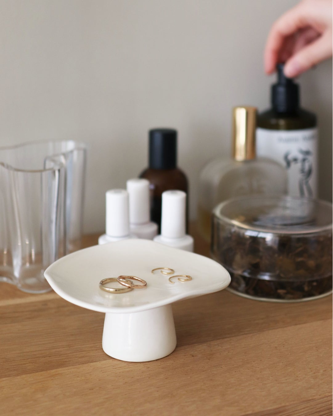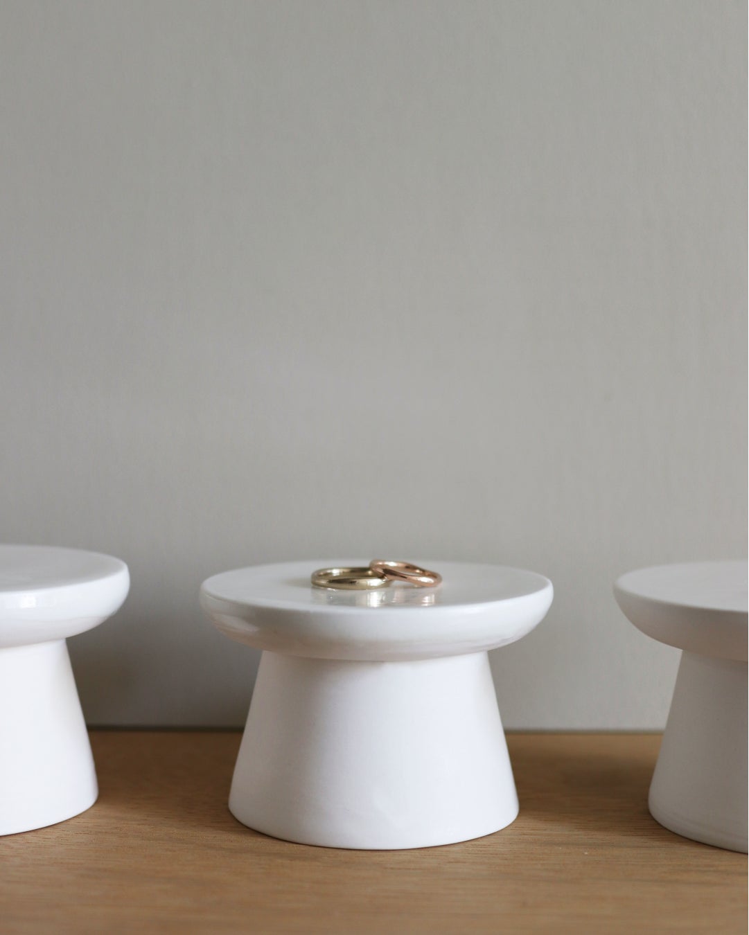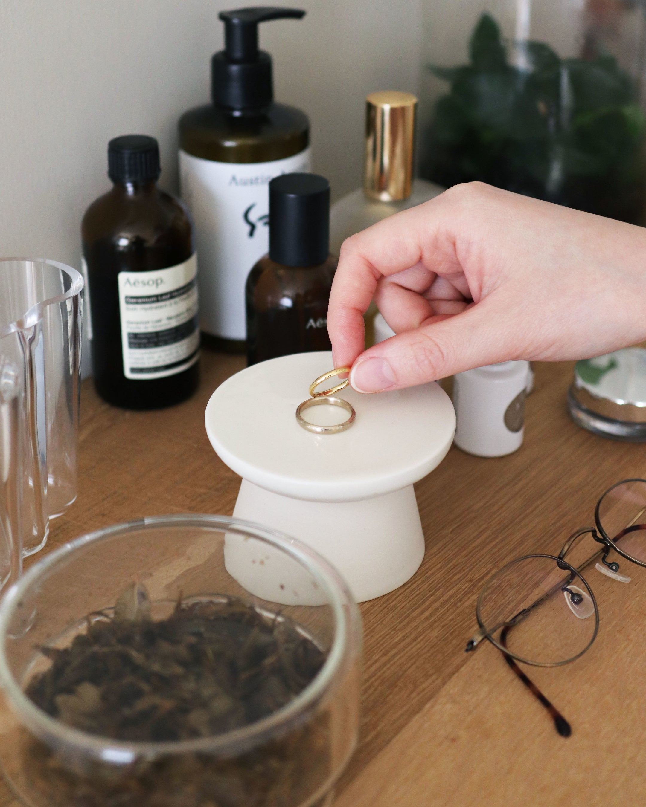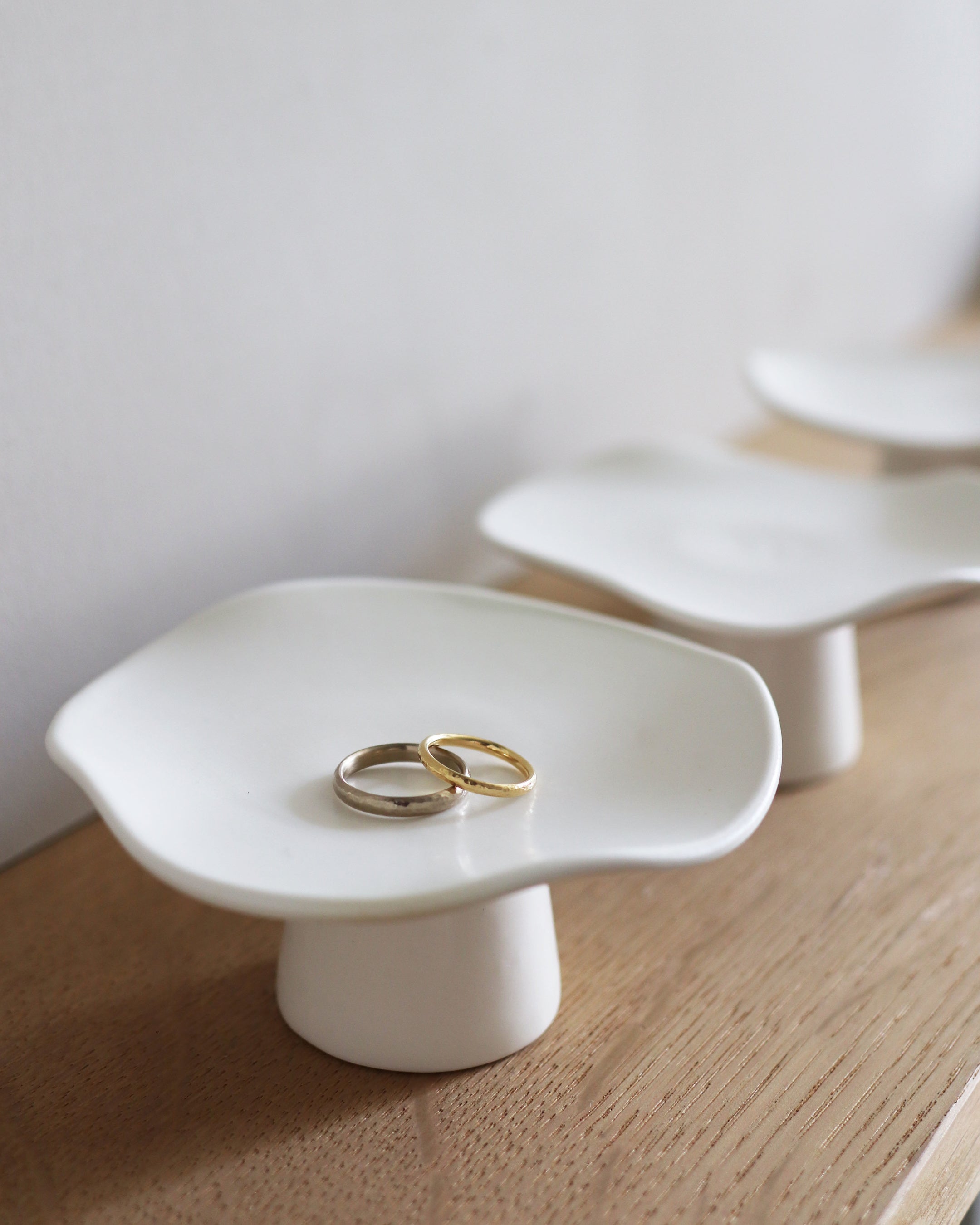 白色のなめらかな陶器は生活の中に自然に溶け込む表情で、でもきちんと指輪のいる場所をきめることで特別感が生まれます。