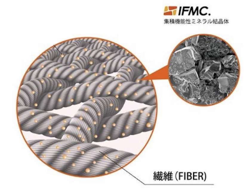 生地には、温泉由来のミネラル成分を使った「IFMC.(イフミック:集積機能性ミネラル結晶体)」による加工を施しています。IFMC.(イフミック)加工を施した衣類を身に着けることで血管から一酸化窒素(NO)が拡散し、血管が拡張することによる血行促進効果が期待できます。