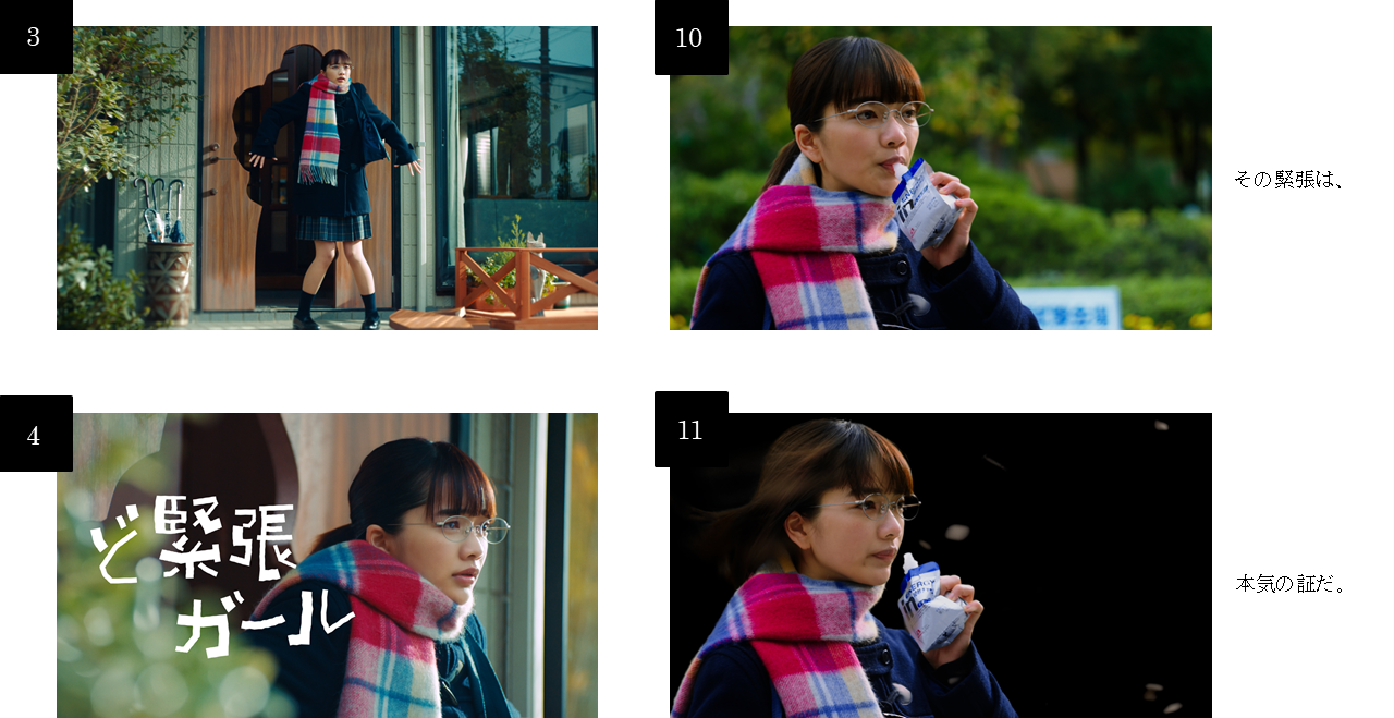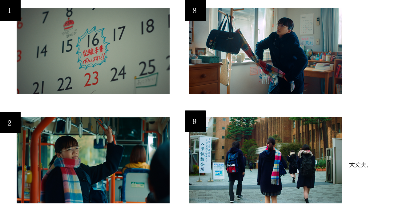 受験会場に向かう際に緊張しすぎてしまう「ど緊張ガール」が、その緊張は自分が頑張ってきたからだと気がつき、本来の自分を取り戻すストーリー。「大丈夫。その緊張は、本気の証だ。」をメッセージに、何かに本気で挑戦するとき緊張してしまうのは、きっとあなたが本気だからと気がつかせてくれる、受験生にエールを贈るCMです。「緑黄色社会」の新曲「キャラクター」の軽快なリズムと様々な人を前向きに後押しする歌詞も、受験生の背中を押してくれます。
