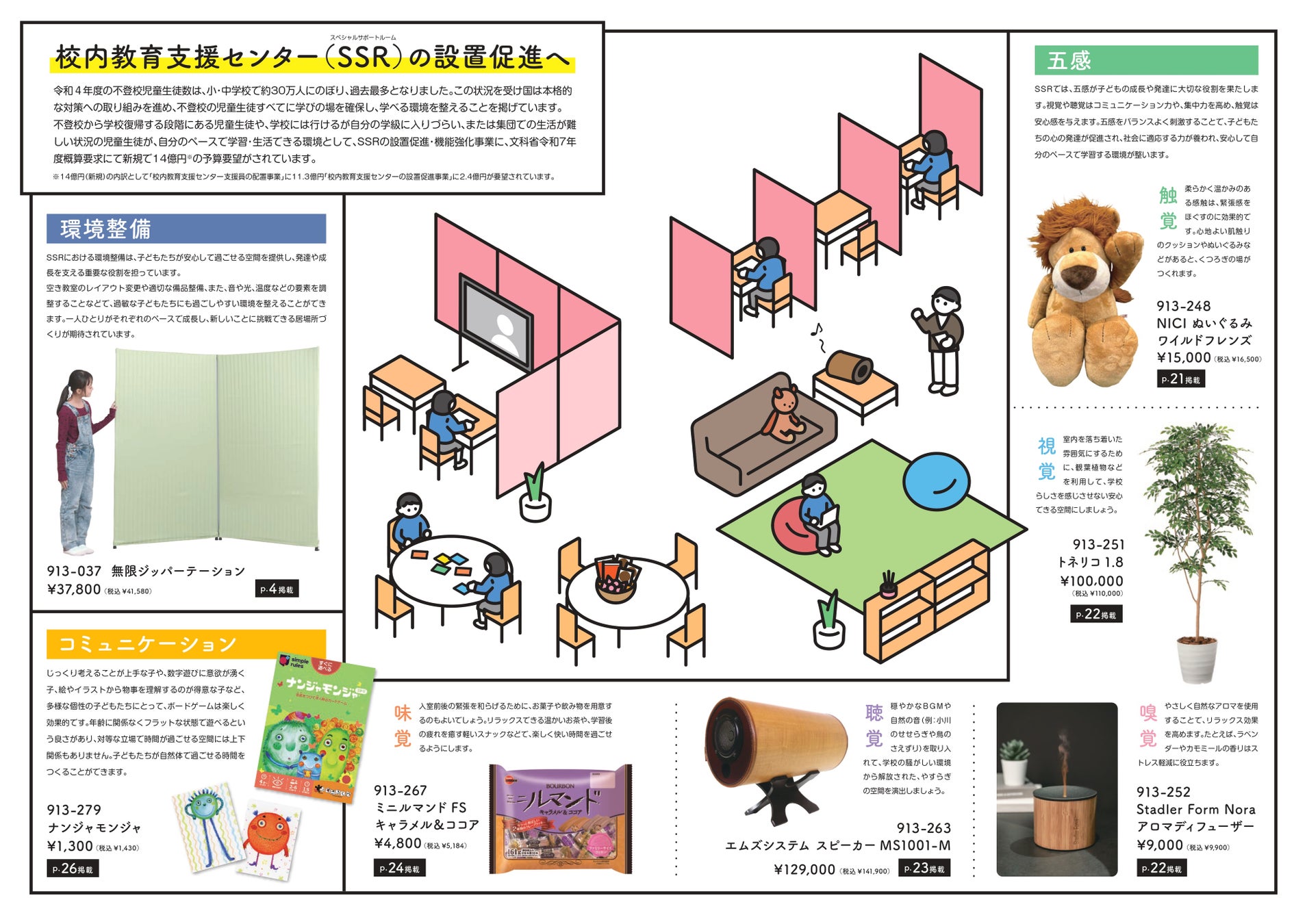 年々増加する不登校問題への取組“学校内の居場所づくり”校内教育支援センター/SSRへ向けた環境整備カタログ「SSR(スペシャルサポートルーム)」10月発刊