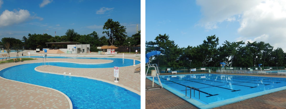 ◆フィッシングパーク内イメージ(左:流水プール、右:50m・25mプール)