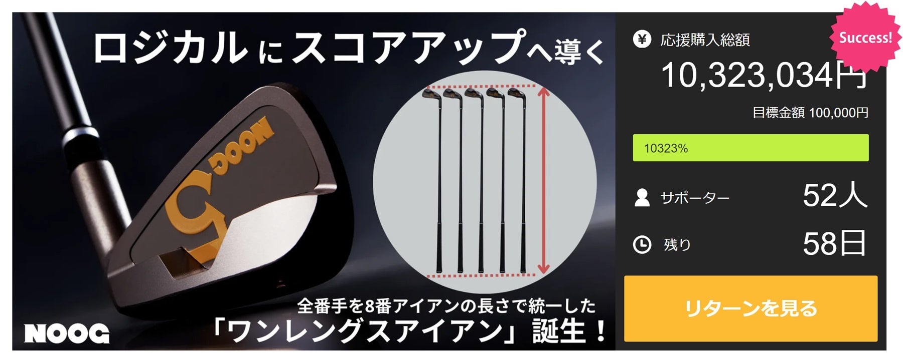 株式会社シンクロ(本社所在地:東京都渋谷区、代表取締役:西井敏恭)は、“ゴルフをアップデートする”ブランド「NOOG」(ノーグ)のワンレングス アイアンセットのクラウドファンディングを8月4日よりMakuakeにて開始し、直後に目標金額を達成、掲載から3日間で達成率10,000%・購入額1,000万円を突破、さらにMakuakeランキング総合1位を2日連続で獲得しました。