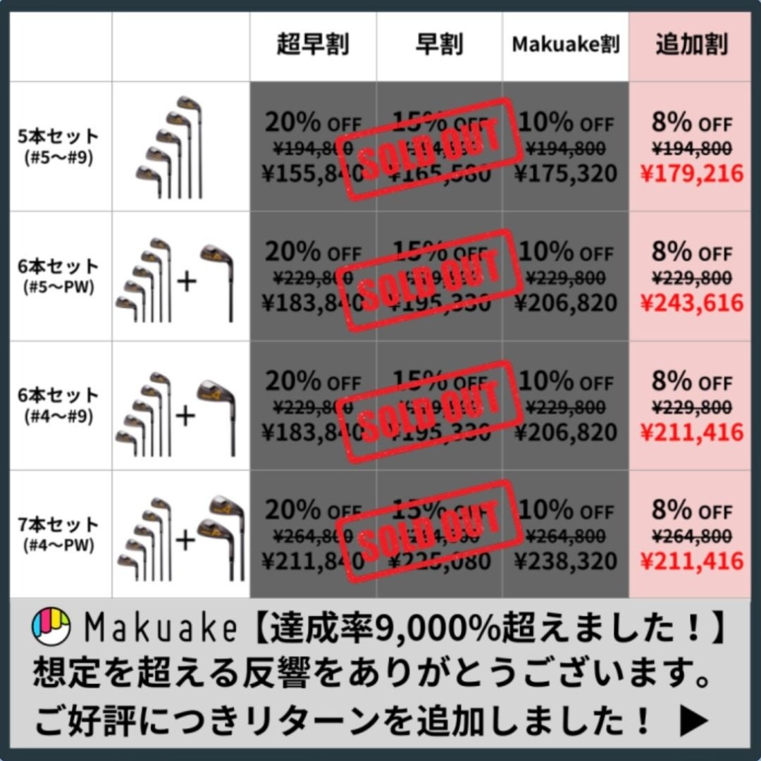 購入金額1,000万円・達成率10000%達成・総合ランキング1位獲得に加え、ゴルフクラブでMakuake史上1位の応援購入金額となりました。(※自社調べ)