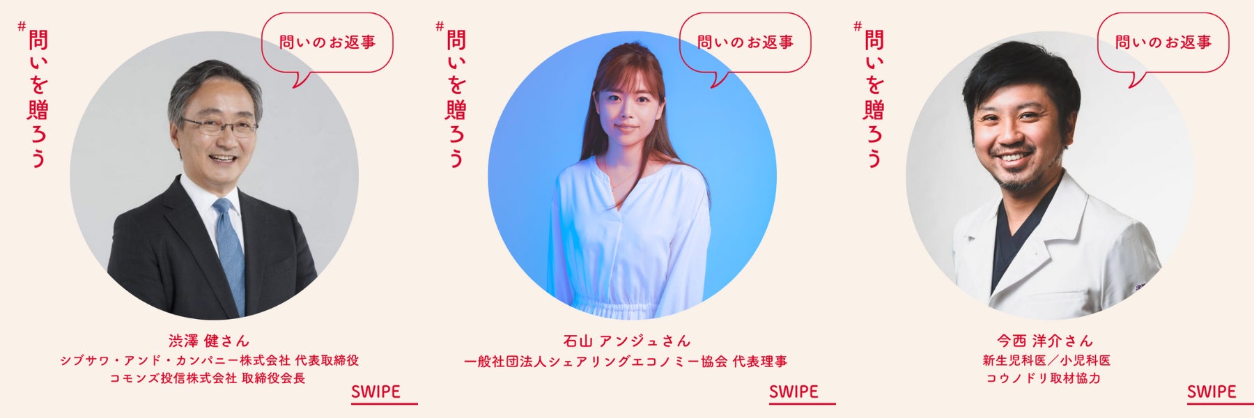 今後、一般社団法人シェアリングエコノミー協会 代表理事 石山アンジュさんやシブサワ・アンド・カンパニー株式会社 代表取締役 渋澤健さん、新生児科医でコウノドリの取材協力をした今西洋介さんからの答えも順次ご紹介していきます。