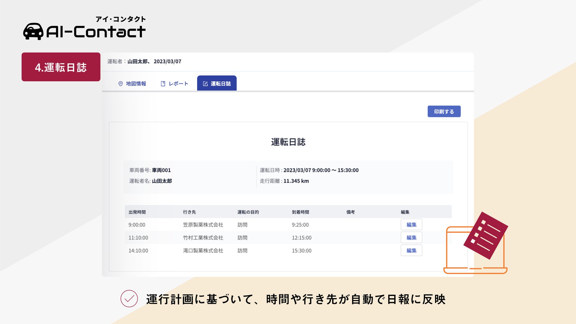 運行計画をもとに、時間や行き先がスマホGPSと連動し、運転日誌に自動で反映されます。