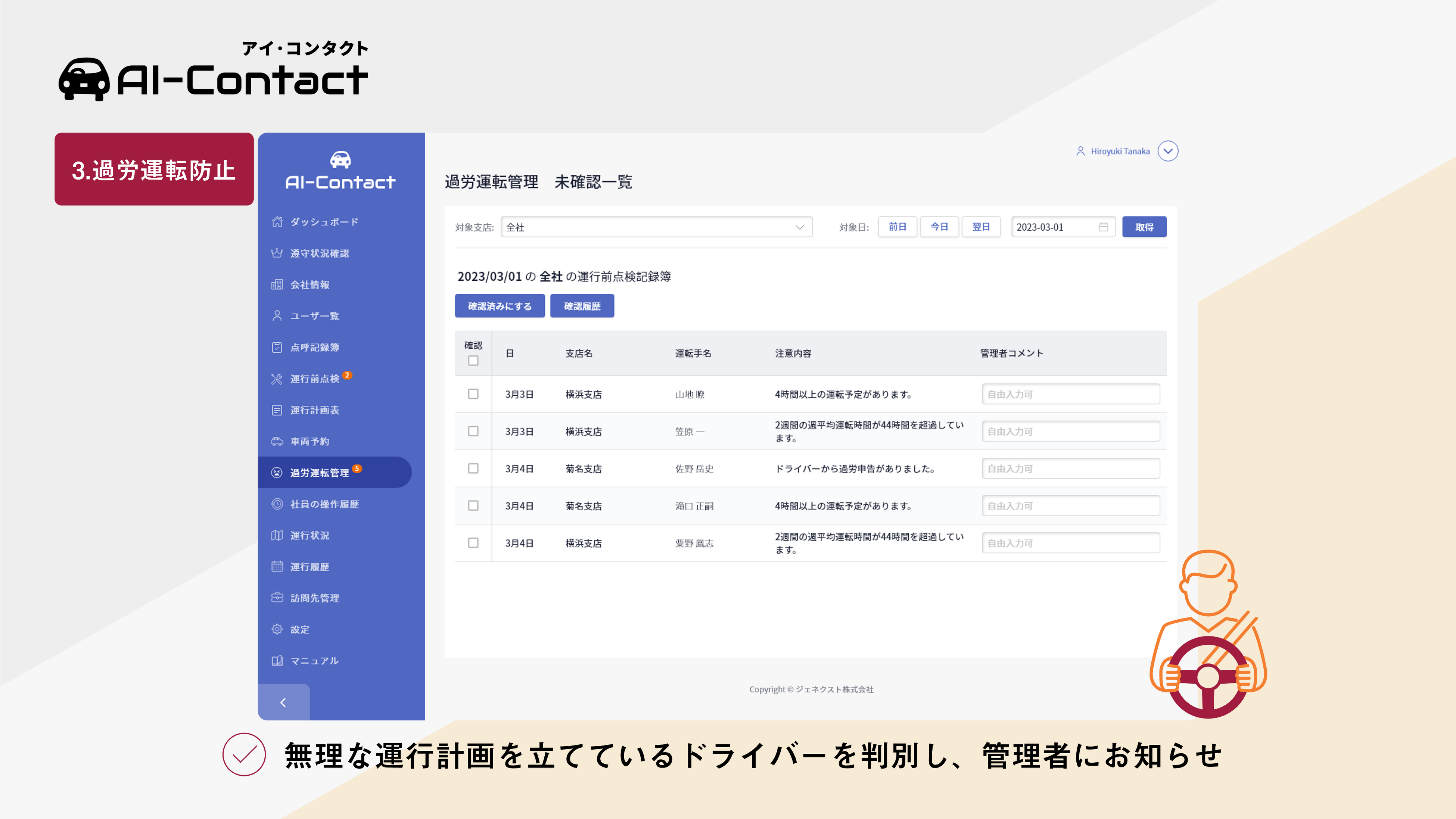 長時間の運転等、無理な運行計画を立てているドライバーを判別し、お知らせします。