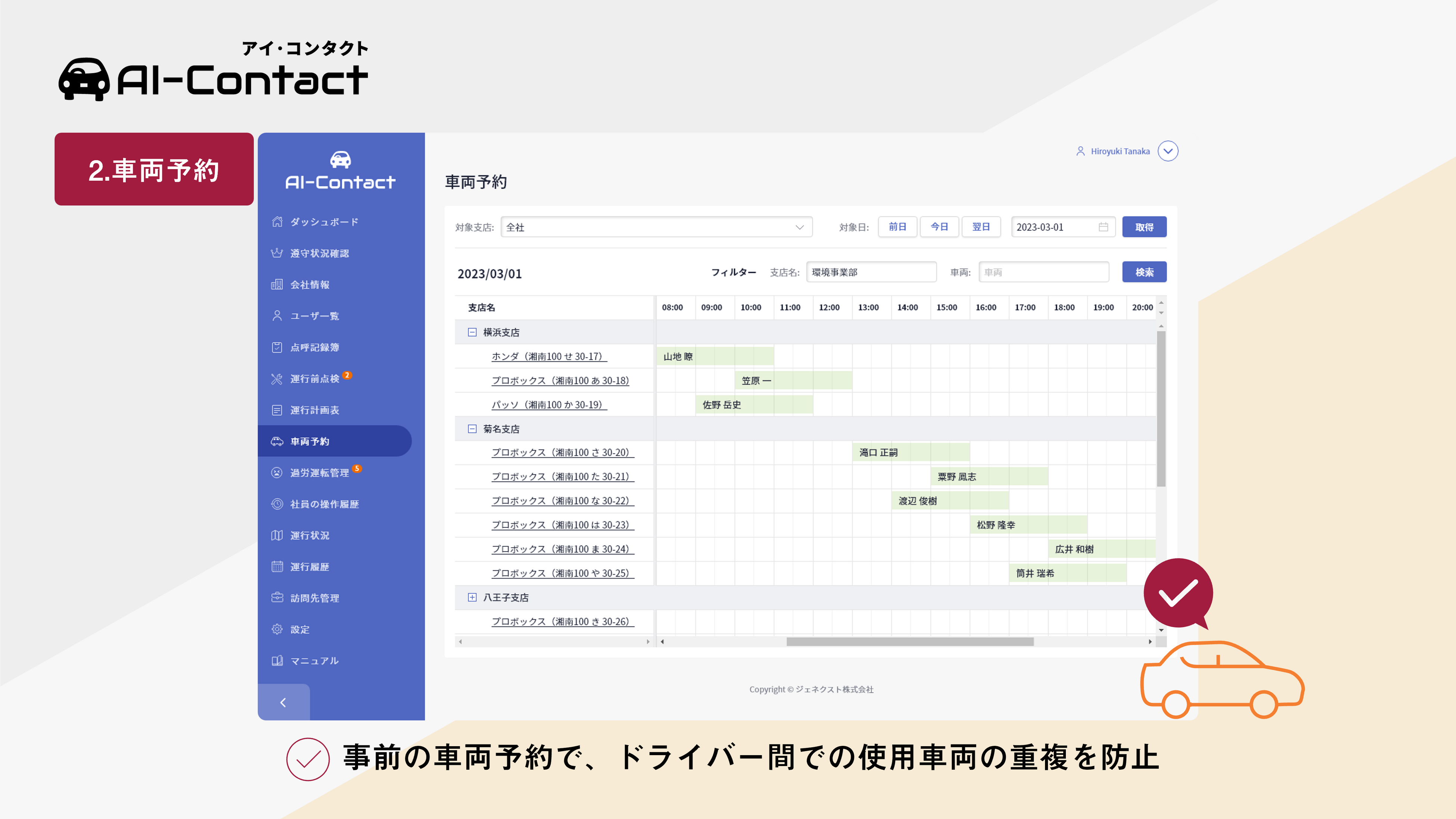 事前の車両予約で、ドライバー間での使用車両の重複を防ぎます。
