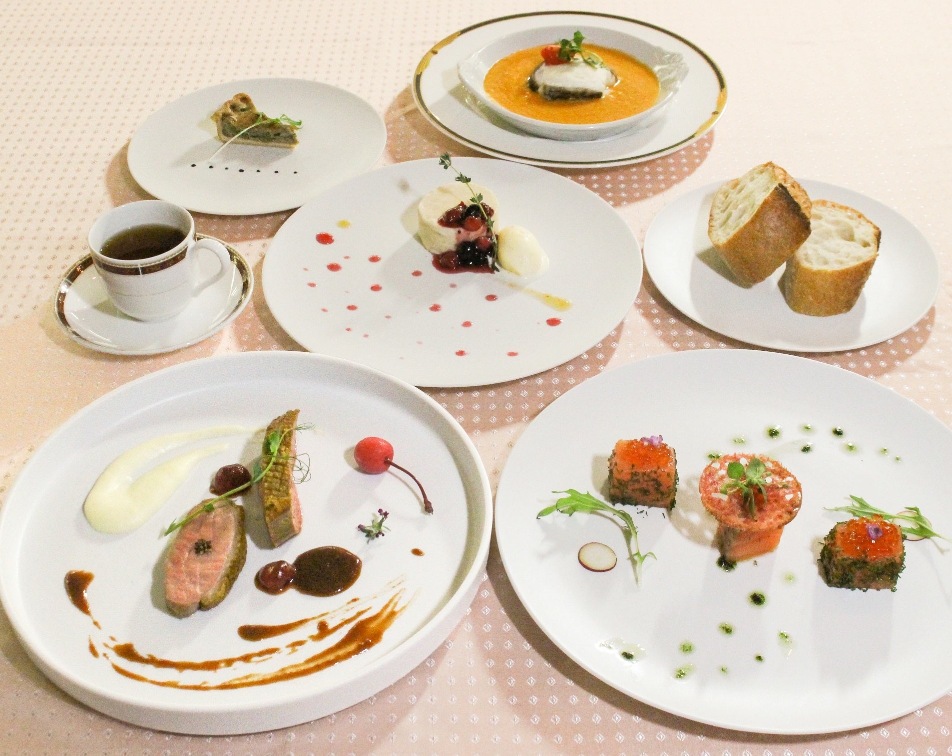 メインの「小鯛のすり身のヴァプールデュグレレ風」は、帆立と白身魚のムースを鯛で巻いて蒸し、魚で出汁をとったトマト風味のバターソースが食欲を刺激します。春の魚の代表である鯛が、美しく桜が咲き誇る春を演出します。