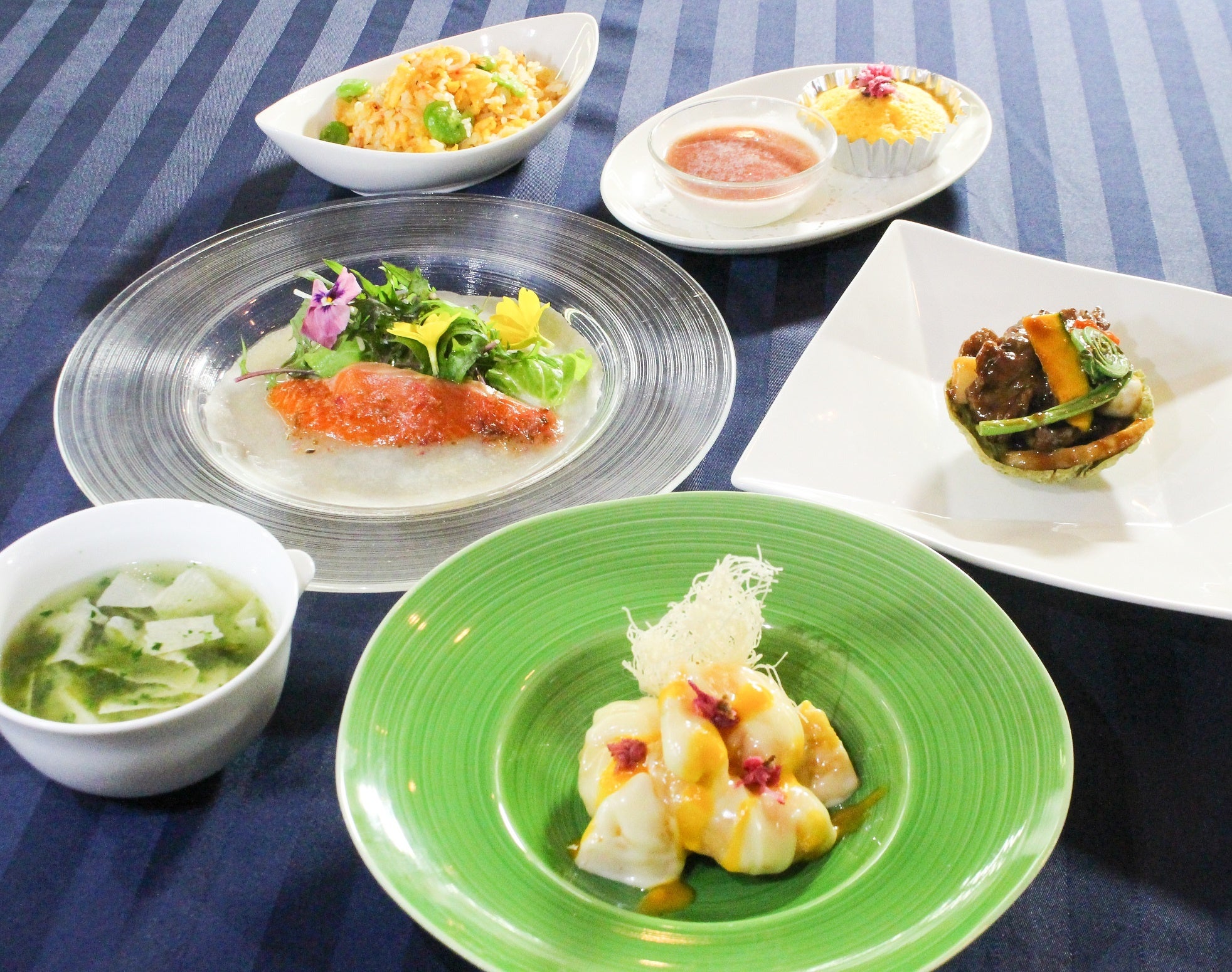 前菜の「春の彩りサーモンのクレープ巻き 桜ソース」は、花畑を思い浮かべ、色とりどりの東北牧場産 無農薬野菜とサーモンを桜のソースでさわやかに仕上げています。主菜は王道中華を旬の食材でお楽しみください。