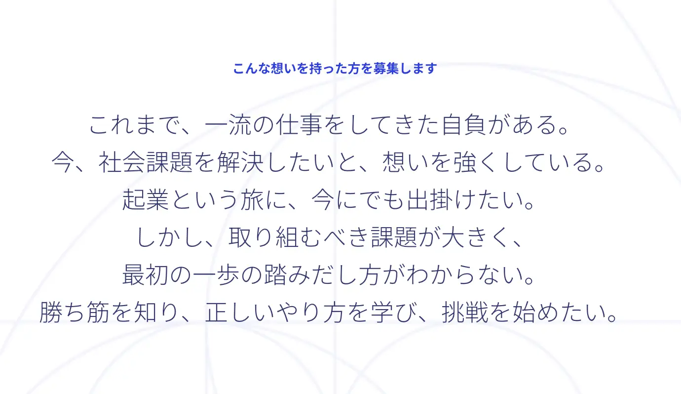 起業を通じて社会・産業にインパクトを与えたいという明確な意志をお持ちの方