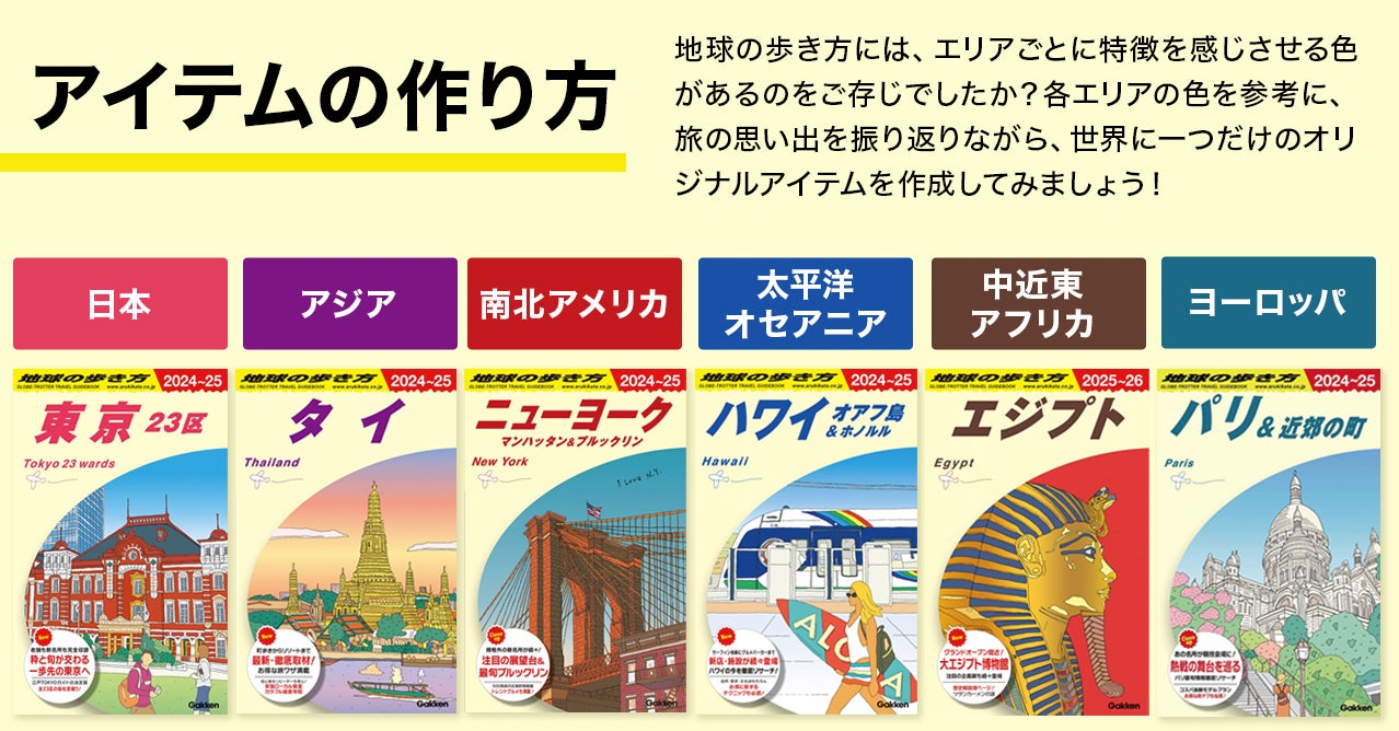 本企画では、旅人のバイブル『地球の歩き方』の表紙デザインを使って、スマホケース・キーホルダー・パスケースなどのオリジナルグッズが作れます。