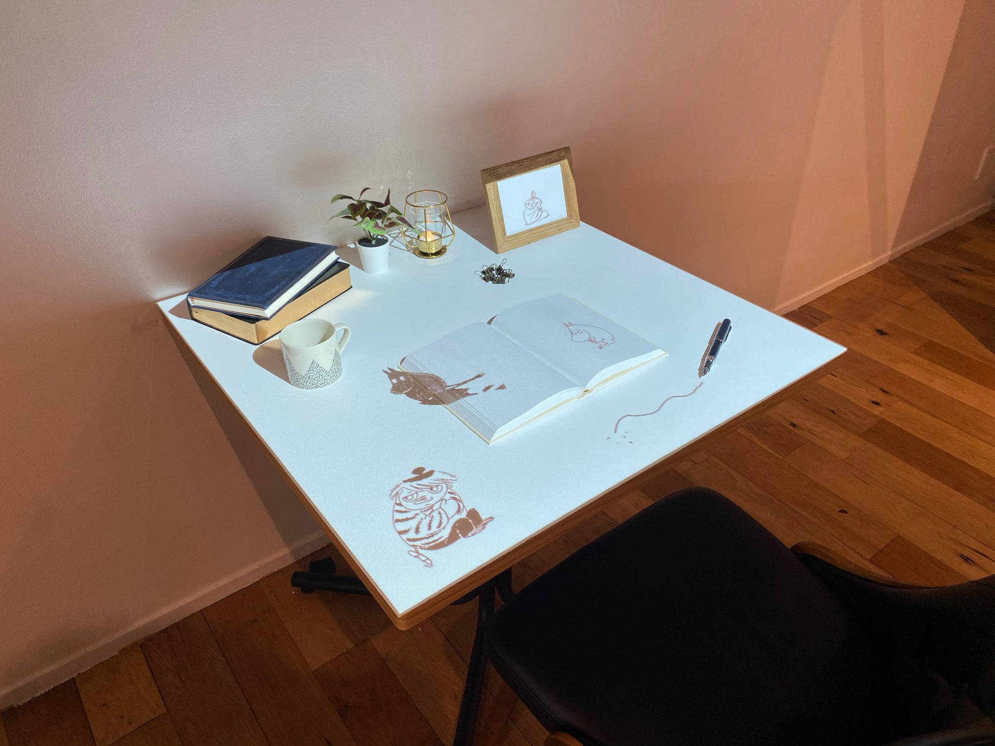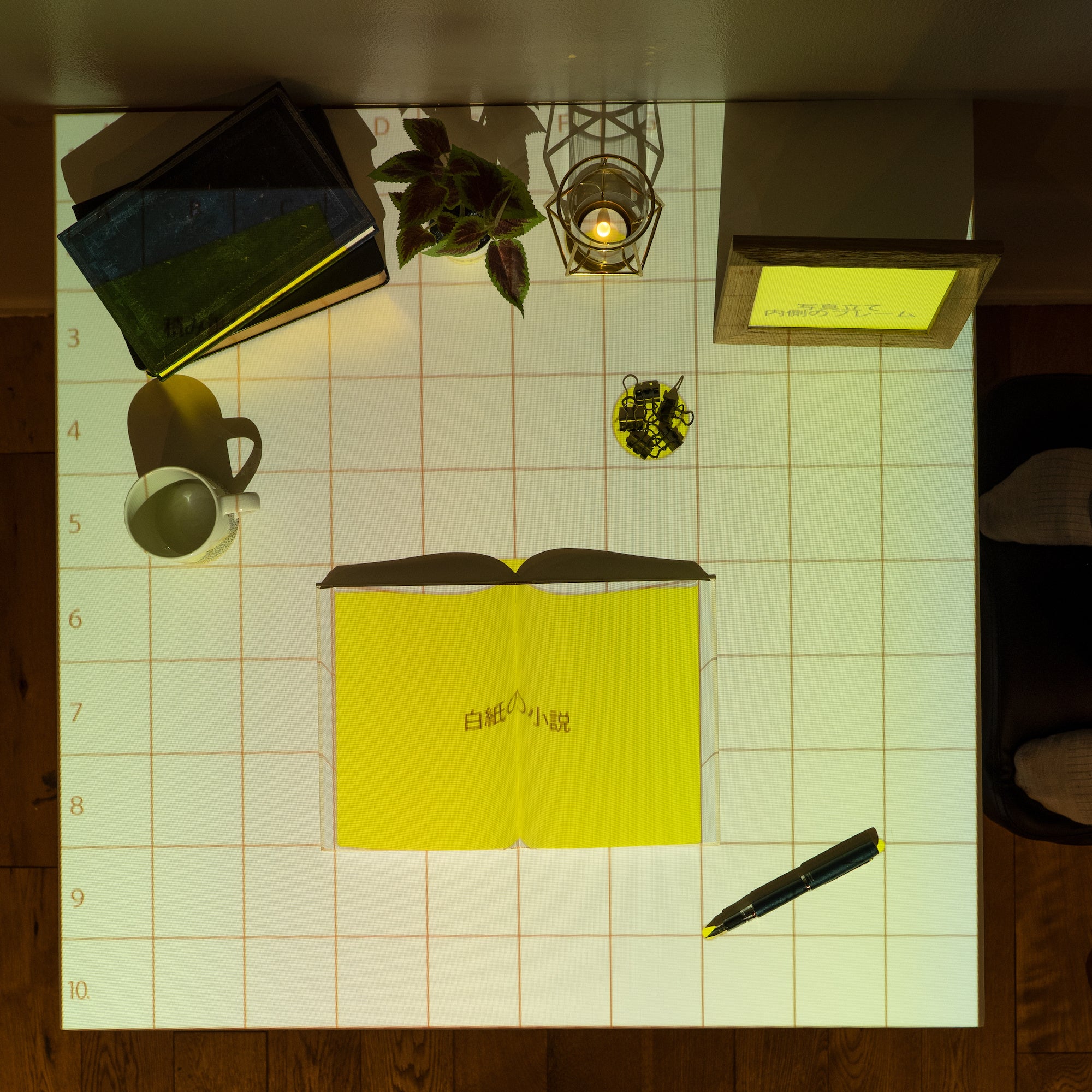 画像のテーブルセッティングに映像を投影します。舞台は、書斎の机の上に置かれた一冊の小説。中身は白紙で、まだ何も描かれていません。そんな一冊の本から、机の上を舞台にムーミンたちの物語が動きはじめます。立体的な空間を演出する事で皆さんの思う体感型映像コンテンツを作ってみてください。