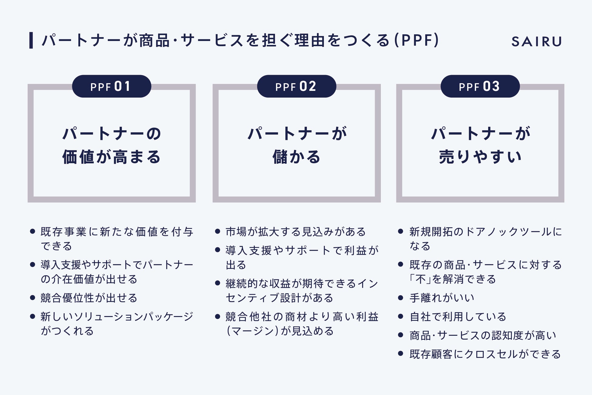 PPFは、メーカーの商品・サービスとパートナーのビジネスモデルが噛み合い、パートナーが「この商材を担ぐ意味がある」と納得できる状態を整理するフレームです。担ぐ理由を「価値が高まる」「儲かる」「売りやすい」という3つの観点から捉えます。そのほかにも、「三益トライアングル」や「価値の地図」など複数のメソッドを組み合わせ、パートナーが自然に動きたくなる仕組みづくりを解説しています。