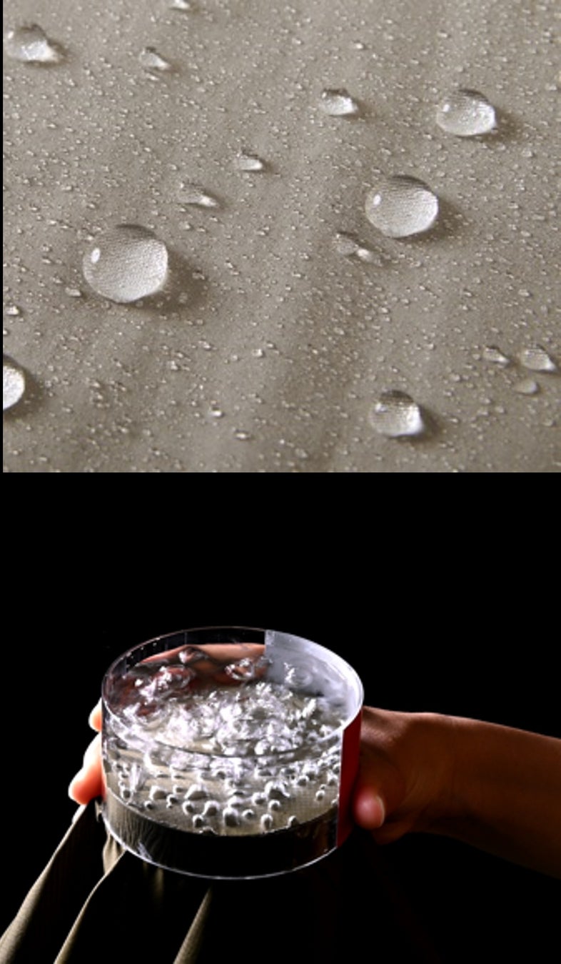 強力な撥水性能は、多少の水であれば生地表面でしっかりと弾き返します(写真上)。