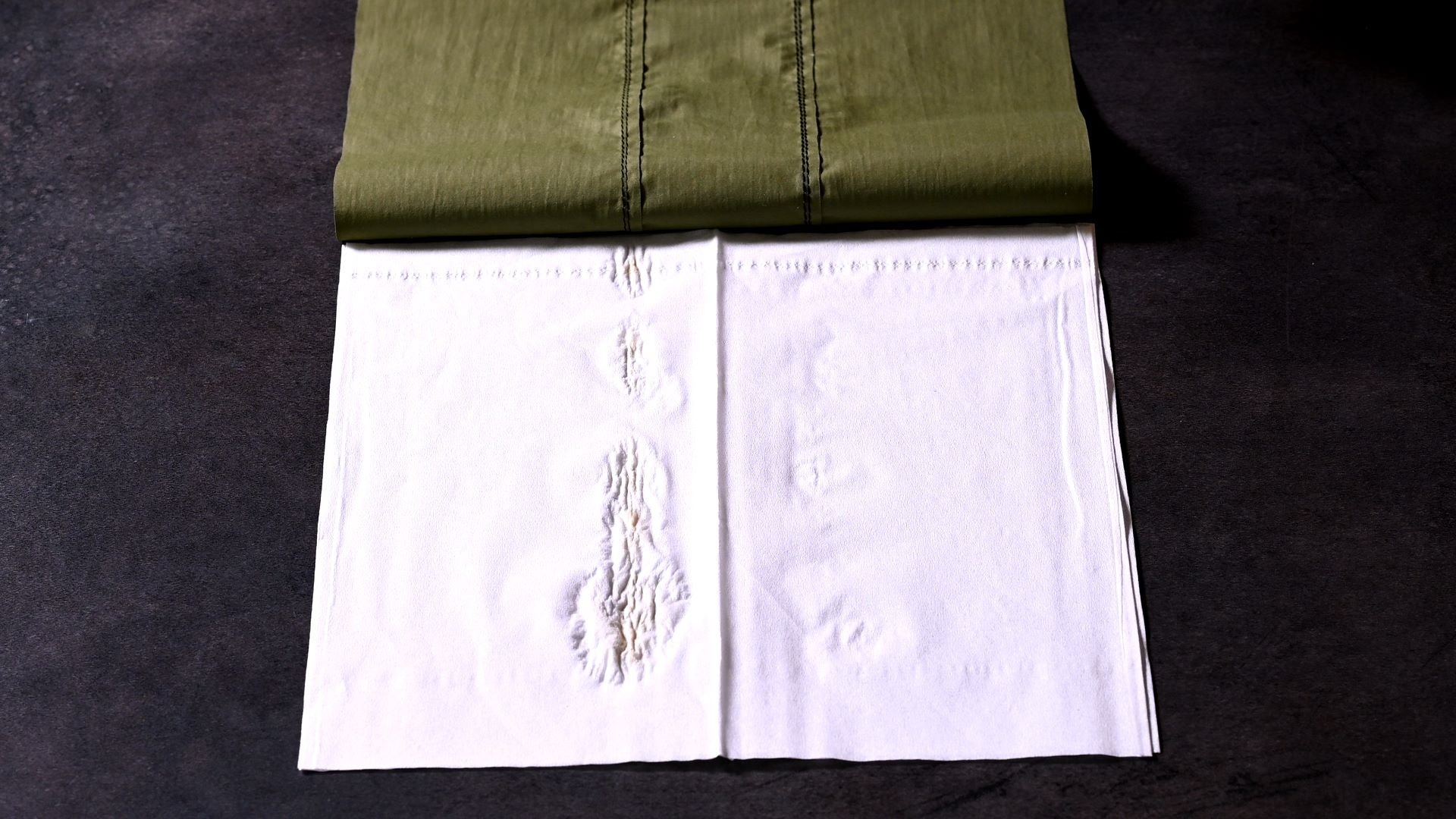 ミレーは縫製に使う糸までこだわります。「ブリーズバリヤー トイ」の縫製には撥水糸を使用し、通常の縫製に比べて縫い目からの浸水を抑制します。下に白い紙を敷き、色をつけた水を縫い目に垂らして撥水性能を比較すると、通常の縫製(写真左)では縫い目から浸水した跡が見られますが、撥水糸による縫製(写真右)では、明らかに浸み出しが少ないという結果が得られています。