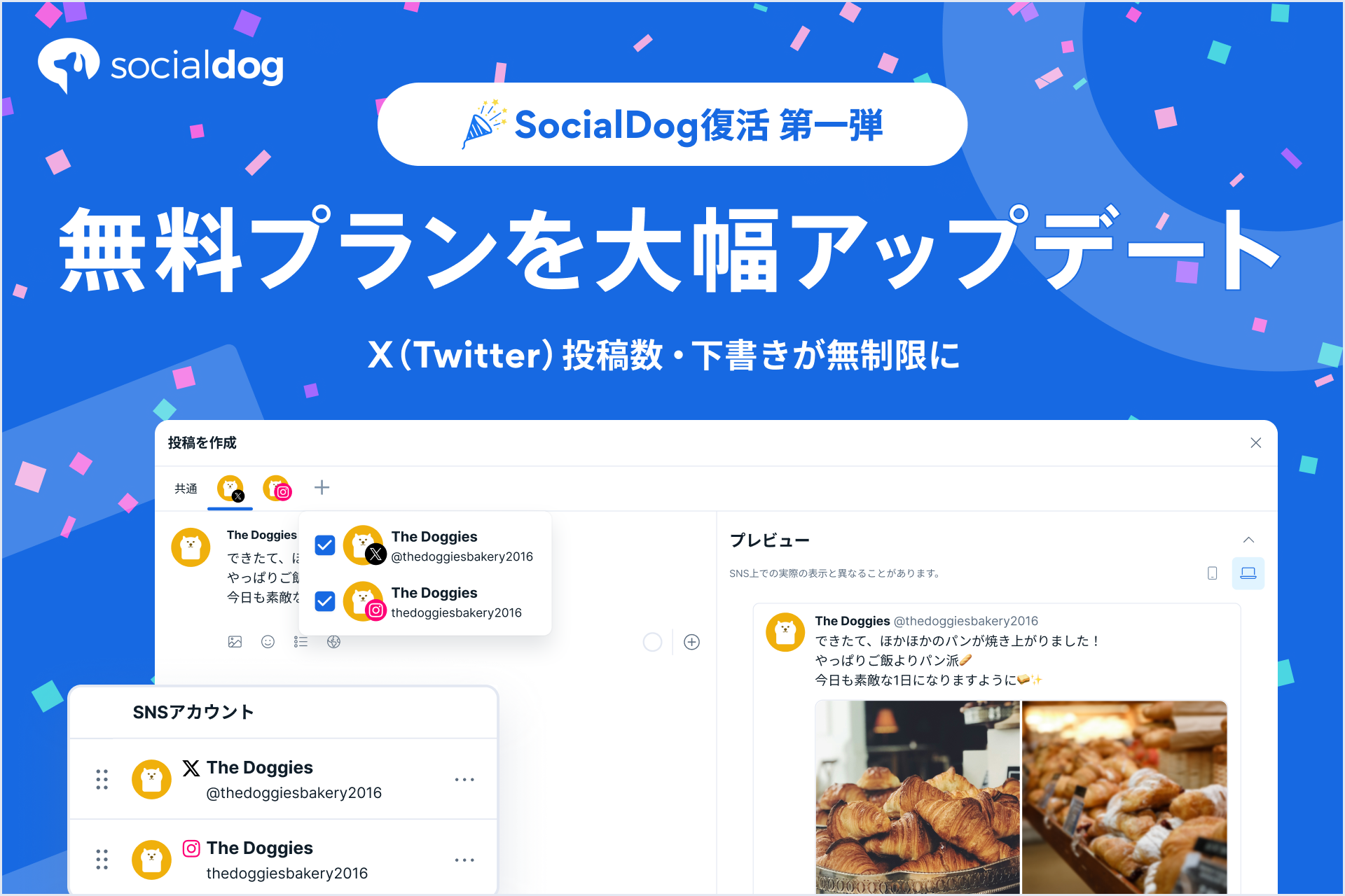 SNS管理ツール「SocialDog」、無料プランを大幅アップデート 〜X(Twitter)の投稿数・下書きが無制限、予約投稿数も緩和〜