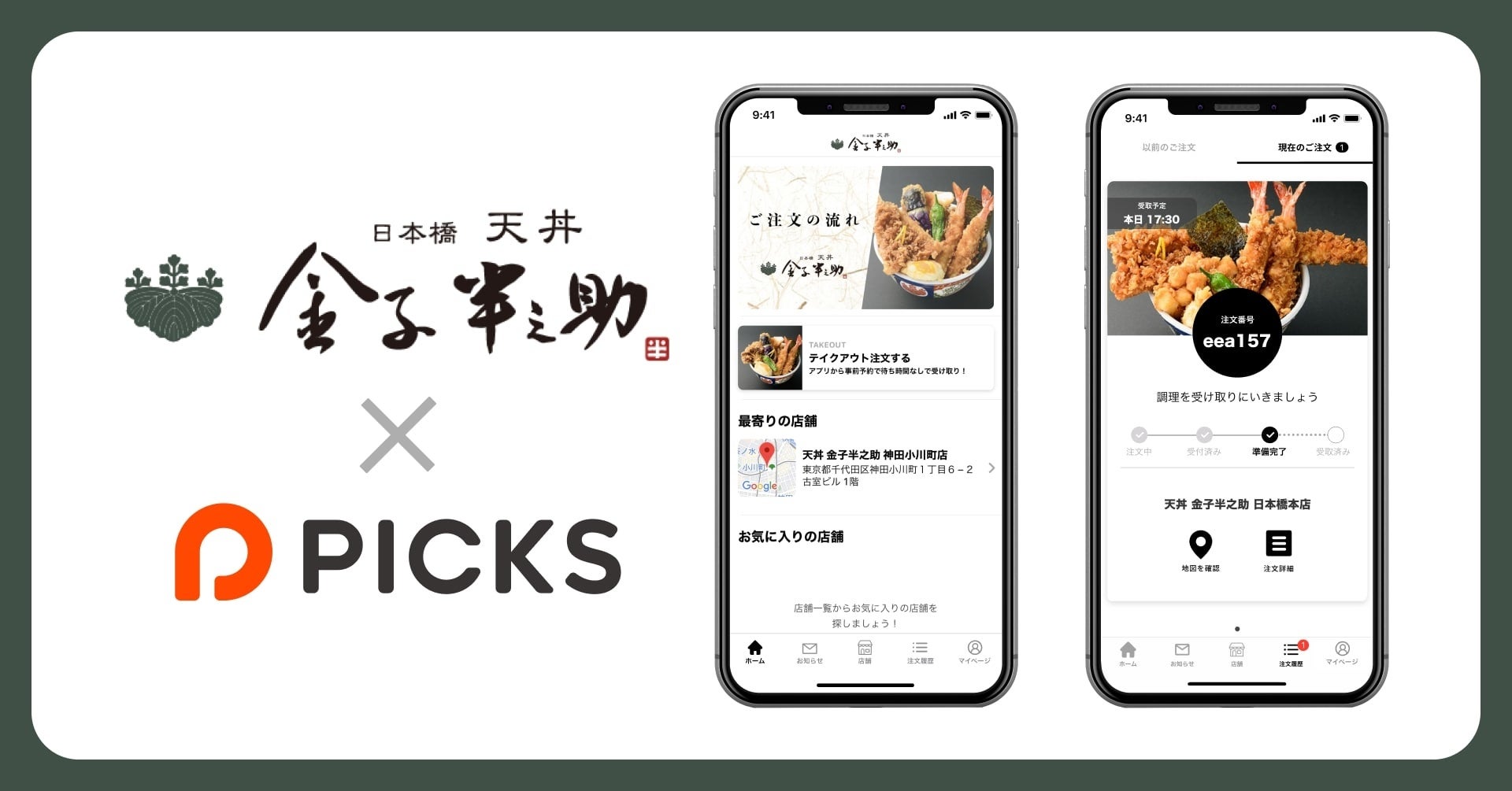 今回、「日本橋 天丼 金子半之助」において多機能なモバイルオーダーアプリがかんたんに構築できる「Picks App」を導入いただき、テイクアウトをスマホから注文できるモバイルオーダーアプリがローンチいたしました。路面店・商業施設内店舗でのテイクアウトを、スマホでオーダーいただくことが可能になりました。クオリティの高い天丼を美味しくお客様に味わっていただけるスムーズな提供が実現することはもちろん、
