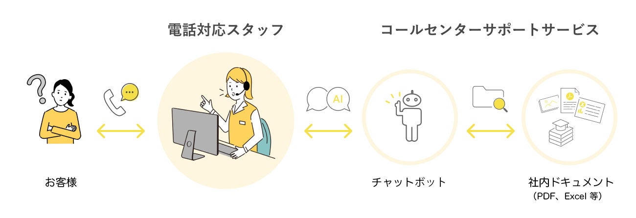 「コールセンターサポートサービス」は、スタッフがチャットボットに質問するだけで、AIが膨大なドキュメントの中から適切なものを探し出し、最適な回答を生成します。
