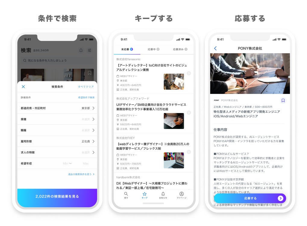 既存のシステム構造は変えずにAPI連携を通して求人アプリの立ち上げを行うことが可能です。自社の求人サイトに合わせたデザインやUI/UXに対応できます。 求人アプリを提供することで、求職者UXの向上・LTVの最大化を実現します。