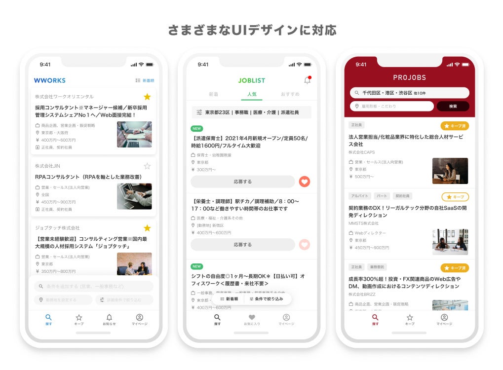 自社の求人アプリGLITで培った求職者に向けた最適なUI/UXを提供します。GLITでは継続的にユーザーインサイトに基づきUI/UXを改善しています。それらの最新のUI/UXの提供はもちろん、御社のニーズに沿ったカスタマイズも可能です。