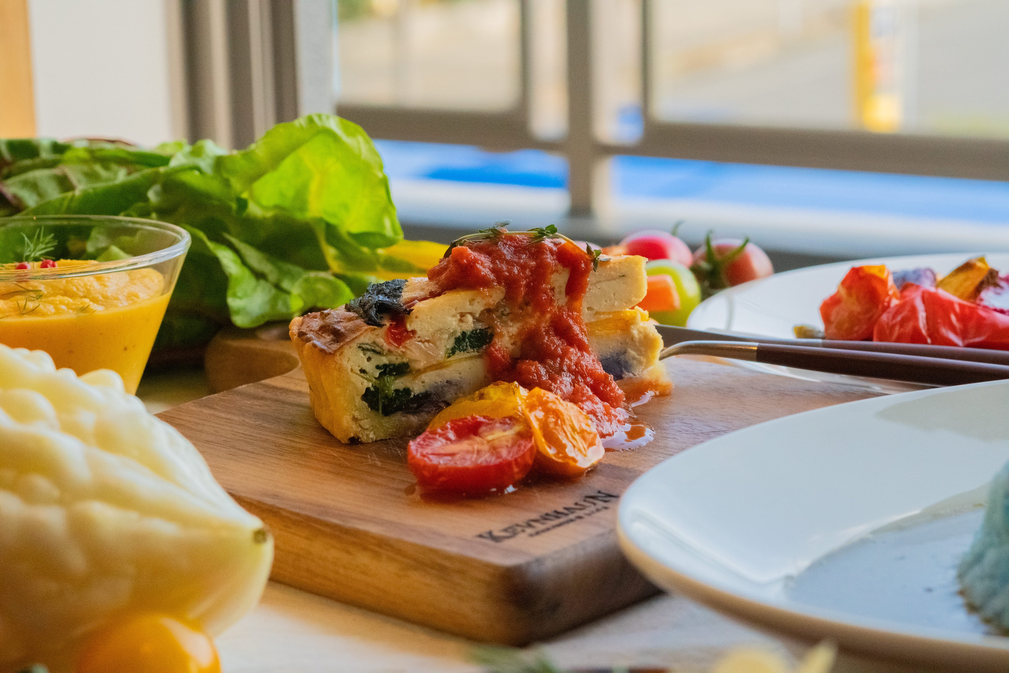 石垣島産の島豆腐と旬の島野菜をたっぷりと詰めこんだ、ヘルシーなキッシュ。トマトソースの酸味と合わせてお楽しみください。