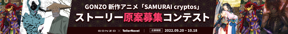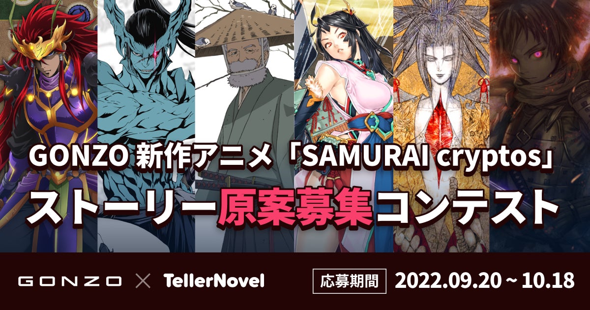 累計DL数600万を突破した次世代向け小説投稿アプリ「テラーノベル」を運営する株式会社テラーノベル(本社:東京都港区、代表取締役社長:蜂谷宣人、以下テラーノベル)と次世代へ向けた映像文化をグローバルに届ける株式会社ゴンゾ(本社:東京都杉並区、代表取締役社長:石川真一郎、以下GONZO)は、GONZOがプロデュースしdouble jump.tokyoがサポートするNFTアニメプロジェクト「SAMURAI cryptos」のイラストを元にしたストーリー原案コンテストを2022年9月20日より募集開始いたしました。