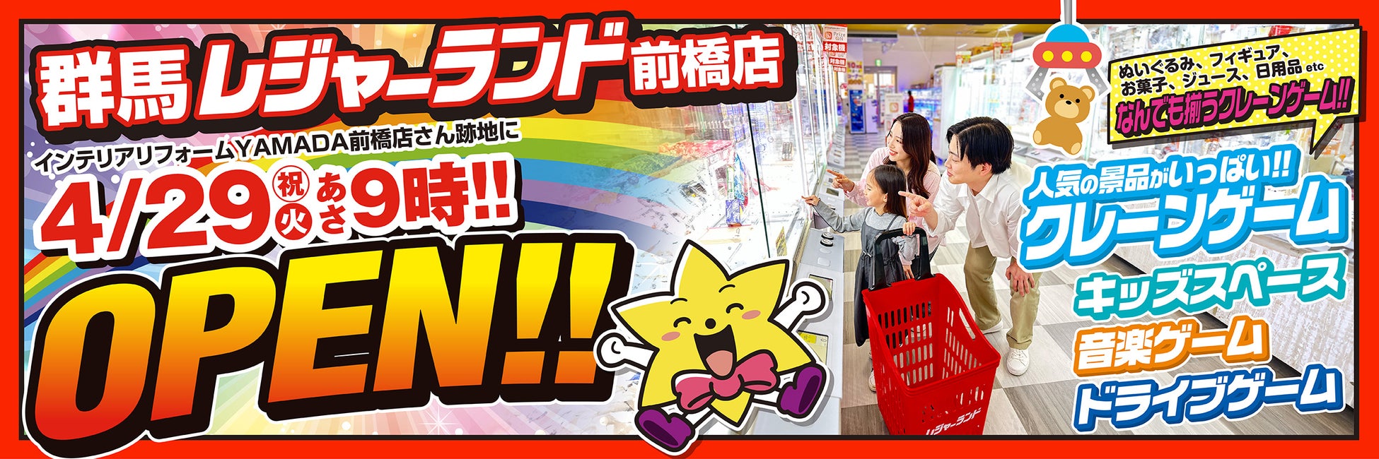 『株式会社山崎屋』(本社:石川県金沢市、代表取締役社長:高登 恵子)は、新たなアミューズメント施設『群馬レジャーランド前橋店』を2025年4月29日(火)にグランドオープンします。