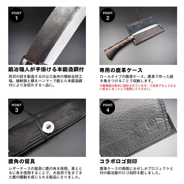 ■おぜしかプロジェクト×村の鍛冶屋 両刃黒打鞘鉈藤乃鉈5寸150mm/5.5寸165mm/6寸180mm &鹿革ナタケース