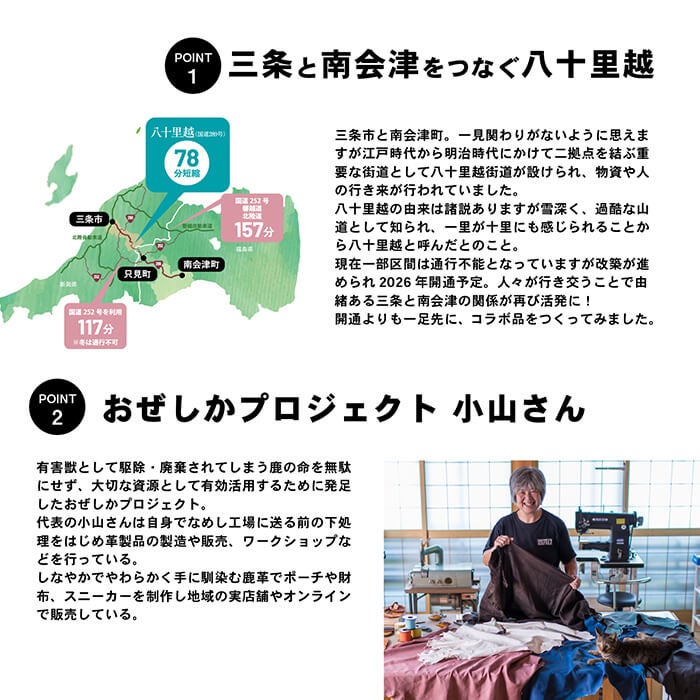 三条市・南会津町側から今回の鹿を取り巻く現状とおぜしかプロジェクト小山さんをご紹介いただいた縁もあり、開通よりも一足先に、三条と南会津町とのコラボ品をつくってみました。