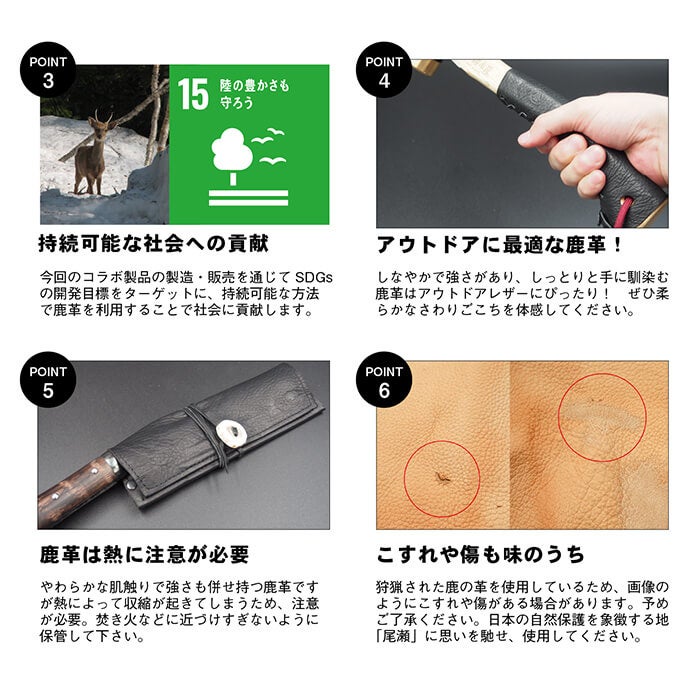 また弊社はSDGs活動を推進しており、今回のコラボ製品の製造・販売を通じてSDGsの開発目標「15.陸の豊かさも守ろう」をターゲットに、持続可能な方法で鹿革を利用することで社会に貢献します。