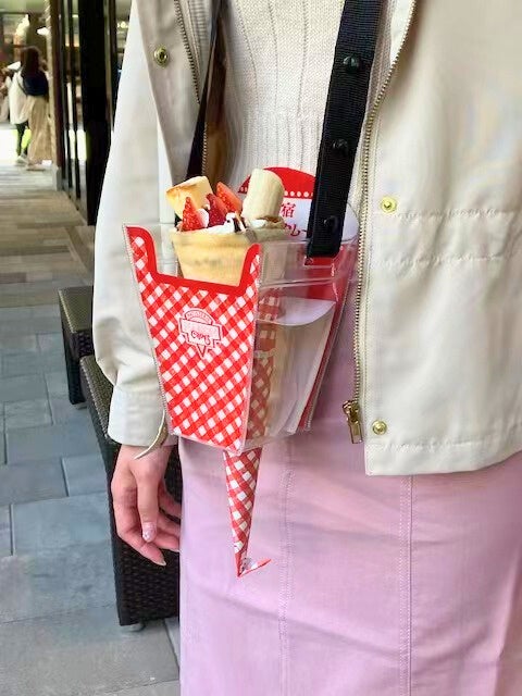 ドリンクを飲みながらクレープを食べられるようになるのはもちろん、クレープを食べ終わった後はドリンクホルダーとしてもお使いいただけます。クレープの食べ歩きが更に楽しくなる、便利で楽しい新商品です。