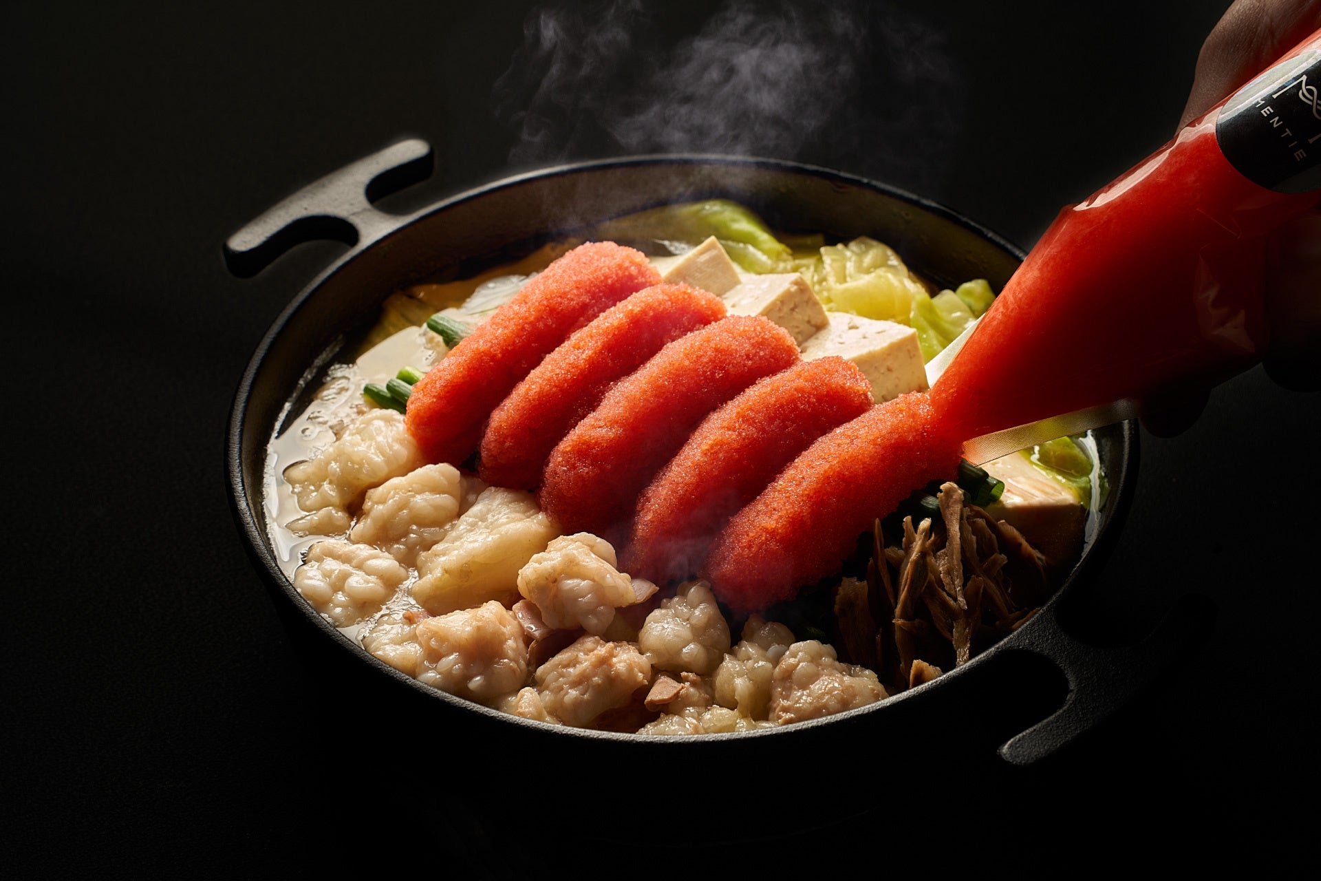 「MENTIE」の明太子と「TAKUNABE」のもつ鍋、個性ある2つが融合しお互いの良さを最大限に引き出すために、余計なものは一切加えず、明太子と牛もつを300gとたっぷり使用。秘伝醤油出汁の上品なスープと、風味豊かな九州産ごぼうに柚子こしょう、〆にはコシのある長崎県産の特製ちゃんぽん麺が3~4人で楽しめ、さらに〆のリゾットまで、プチプチの明太子が溶け出したスープを一滴残さず食べたくなる満足感のあるもつ鍋です。