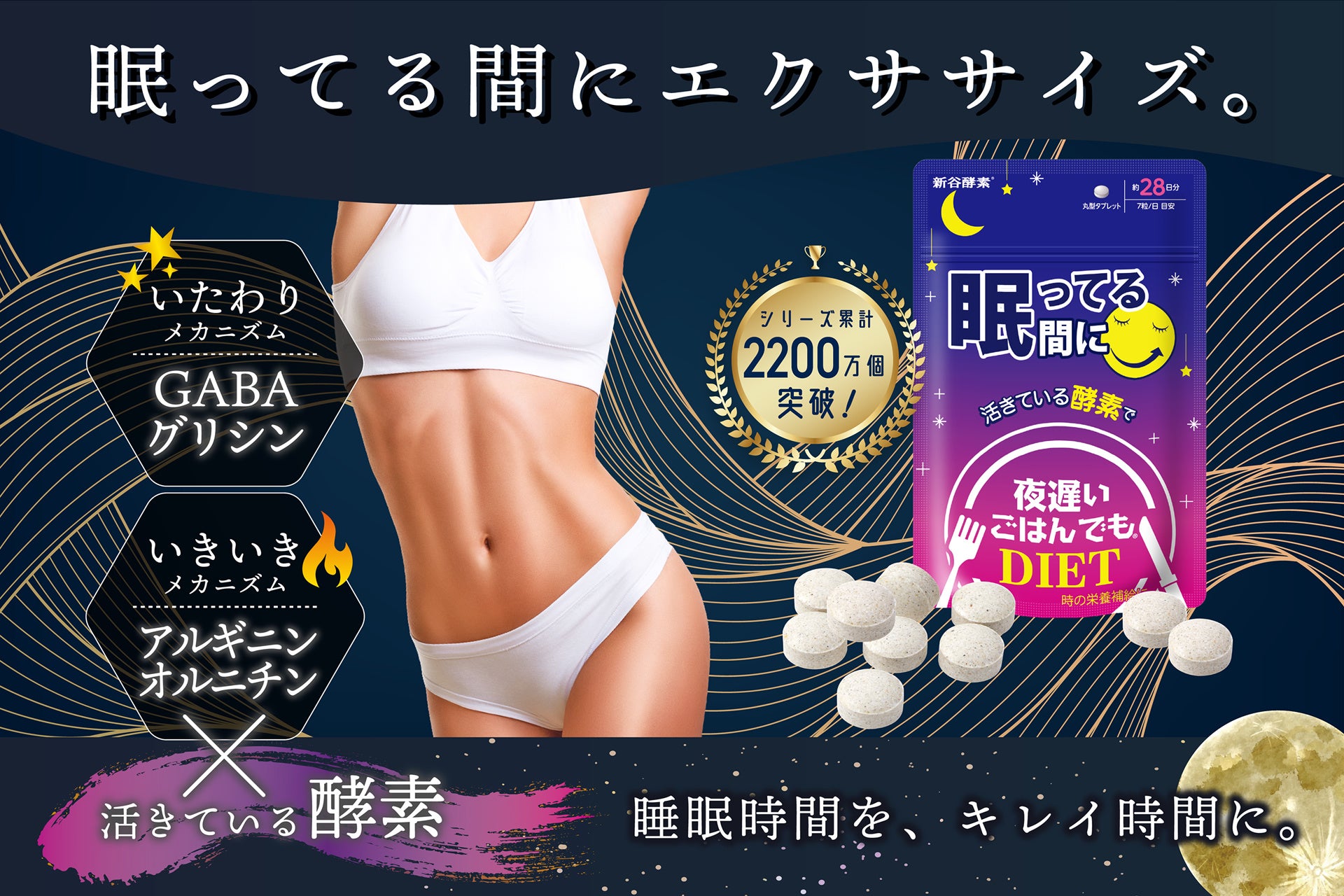 「眠っている間にエクササイズ※」をコンセプトに、GABA、グリシンがいたわりをサポートし、アルギニン、オルニチンがいきいきとした身体をサポート。さらに新谷酵素独自の“活きている酵素”も配合。運動してもあまり効果が感じられない、食事管理がうまくいかない、スッキリとした毎日を送りたいといった方にお試しいただきたいサプリメント。身体本来のコンディションを整え、理想的な身体づくりを目指します。